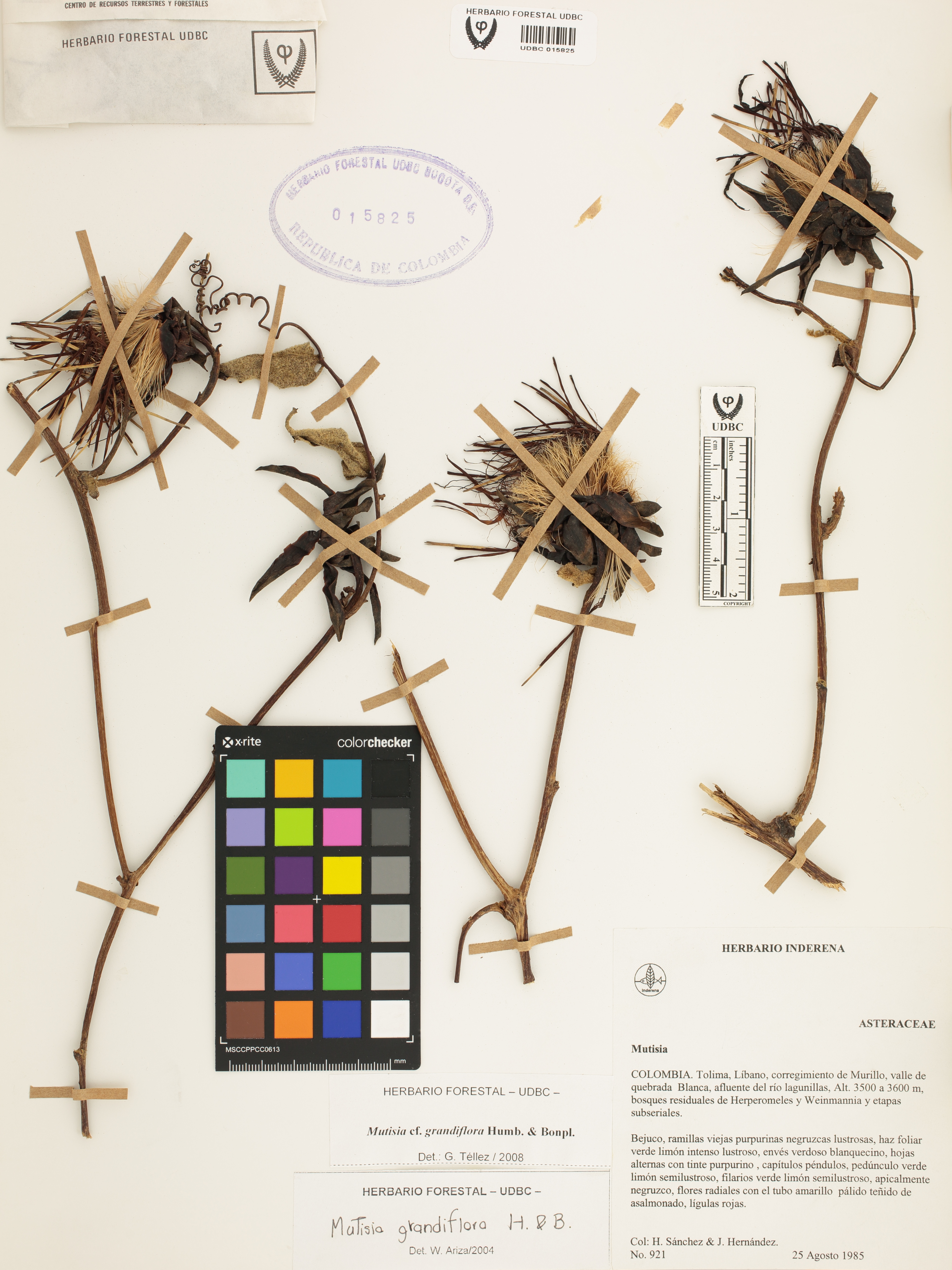 Fotografía del ejemplar Sánchez, H. 921, determinado como Mutisia grandiflora en el año 2008
