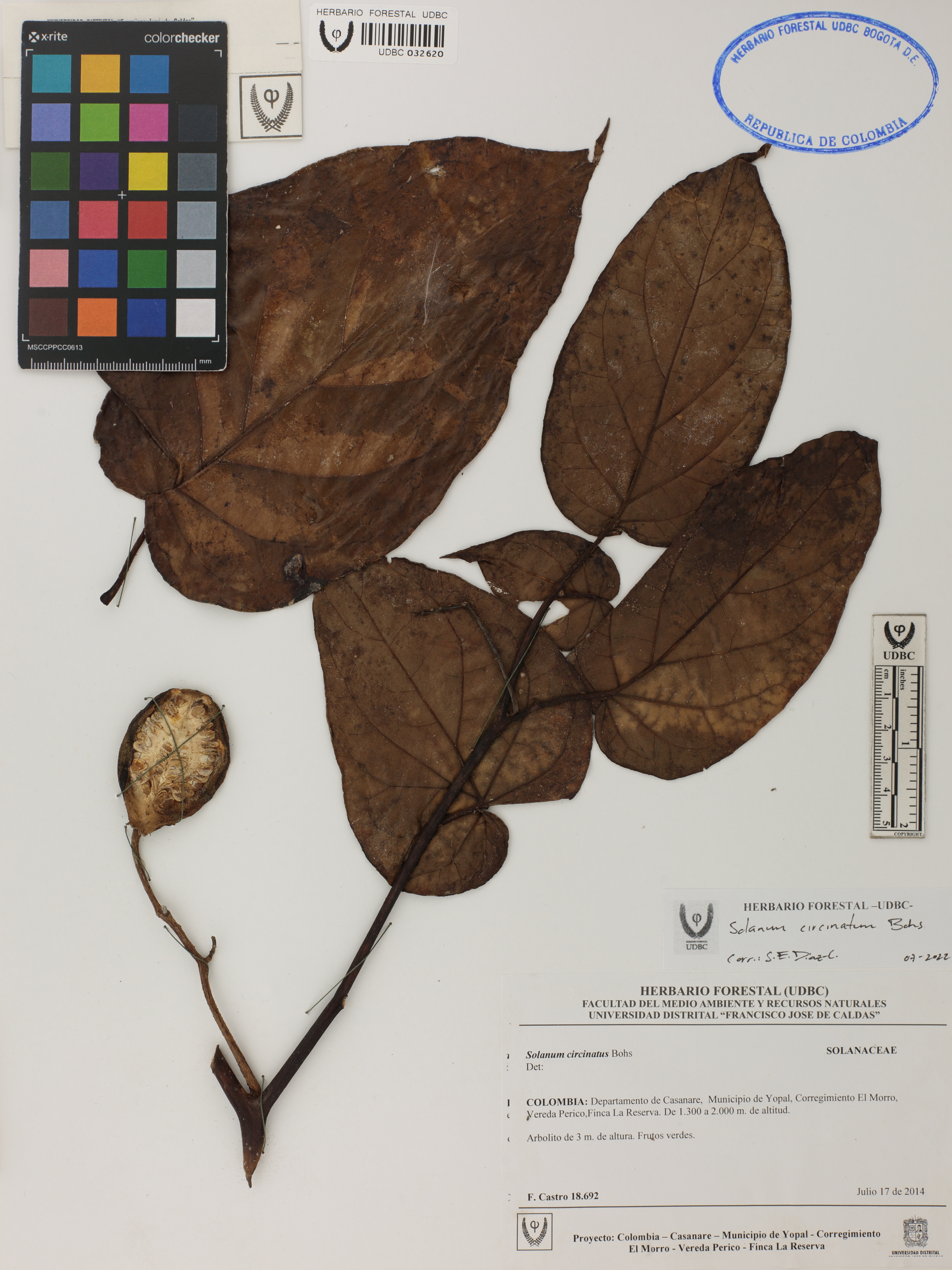 Fotografía del ejemplar Castro, F. 18692, determinado como Solanum circinatum en el año 2014