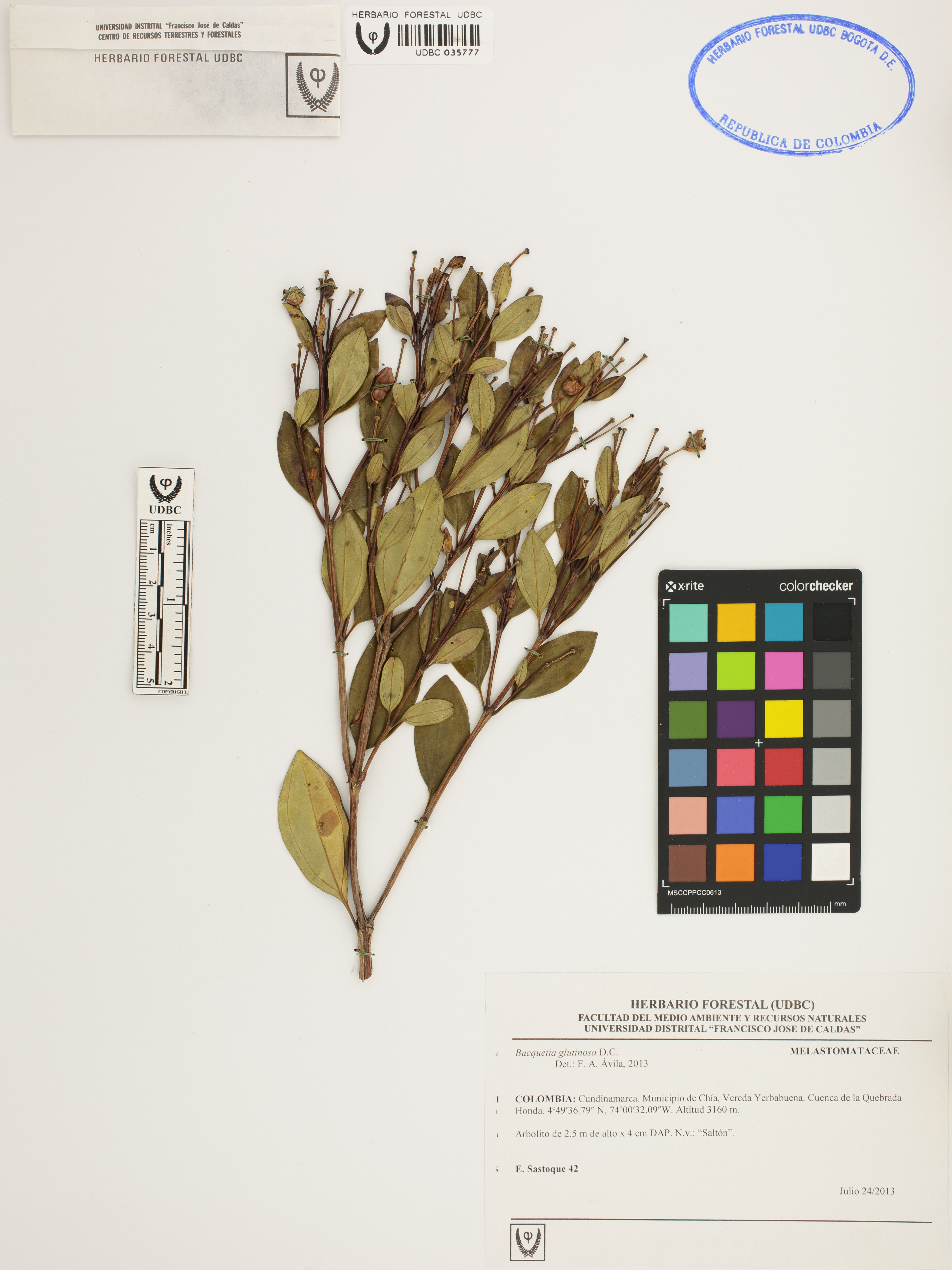 Fotografía del ejemplar Sastoque, E. 42, determinado como Bucquetia glutinosa en el año 2013