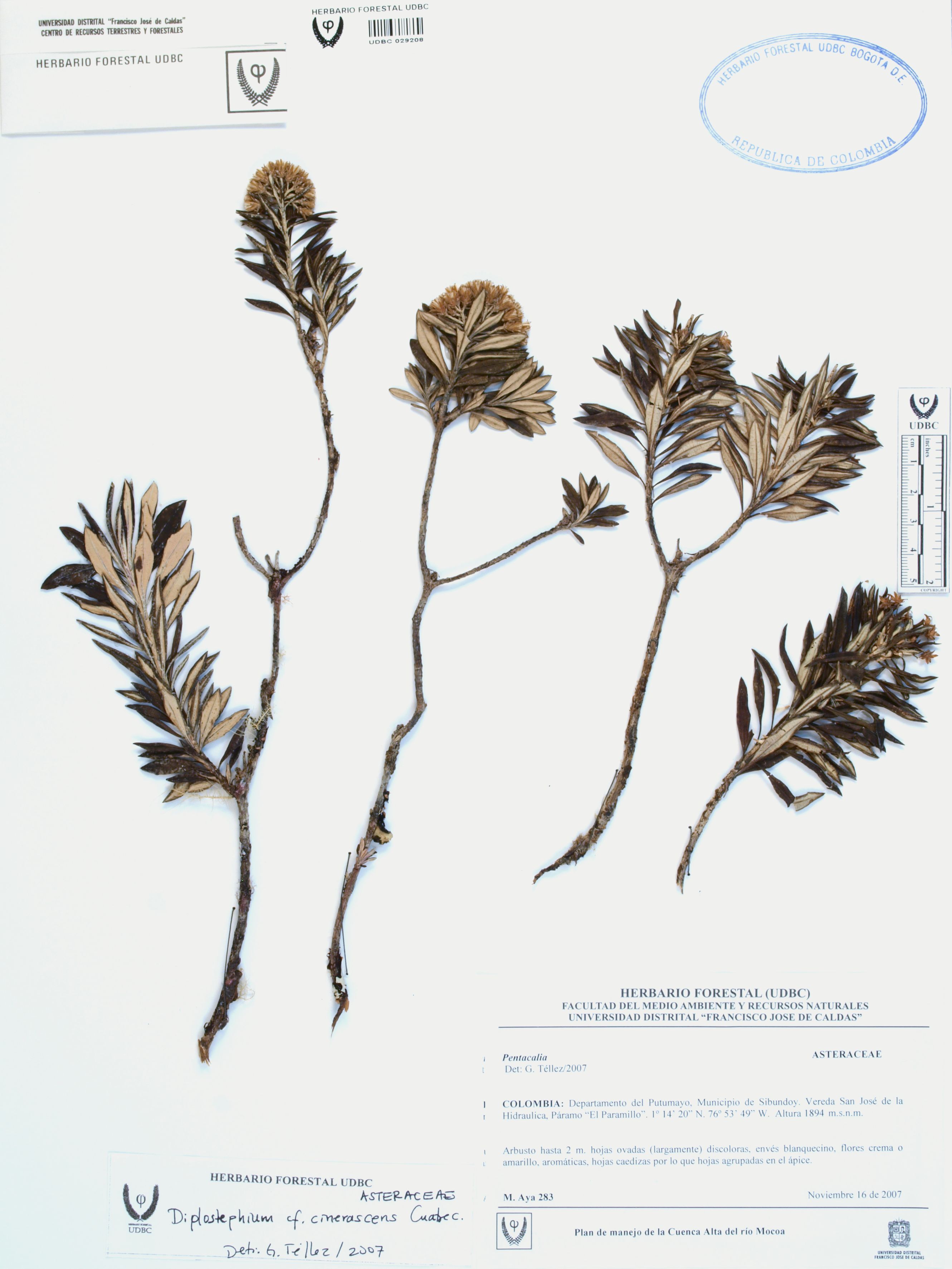 Fotografía del ejemplar Aya, M. 283, determinado como Diplostephium cinerascens en el año 2007