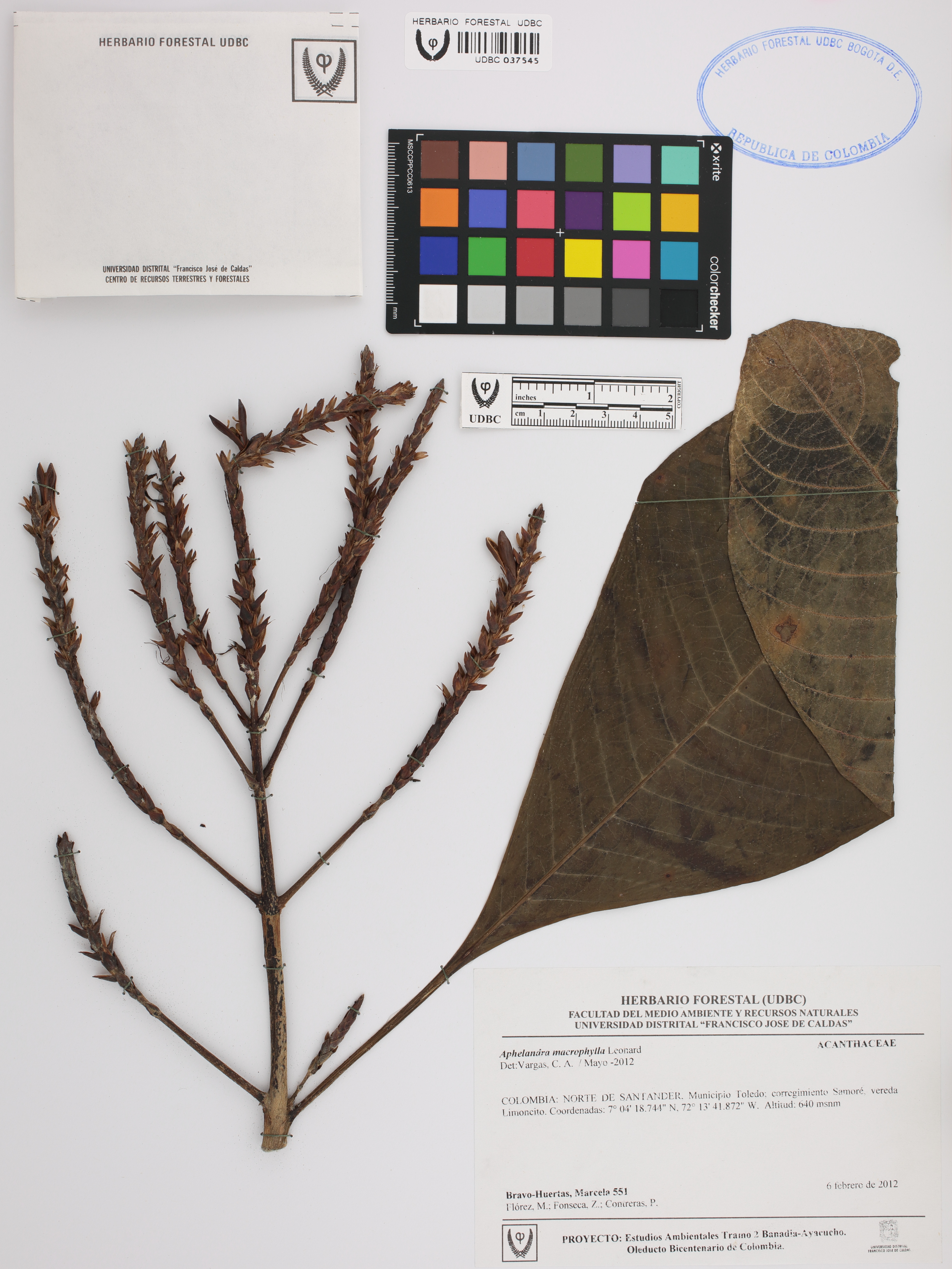 Fotografía del ejemplar Bravo-Huertas, M. 551, determinado como Aphelandra macrophylla en el año 2012