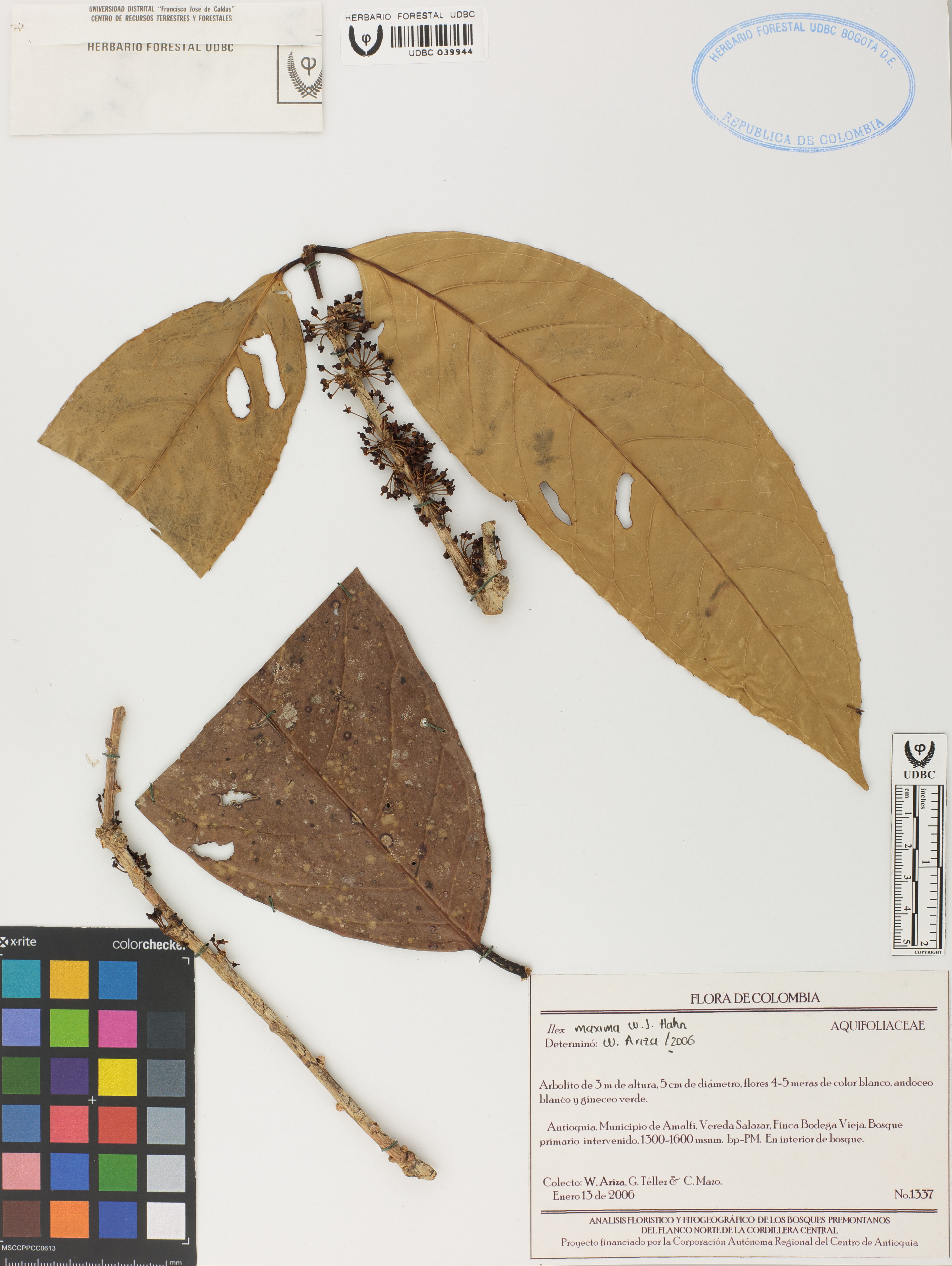 Fotografía del ejemplar Ariza, W. 1337, determinado como Ilex maxima en el año 2006