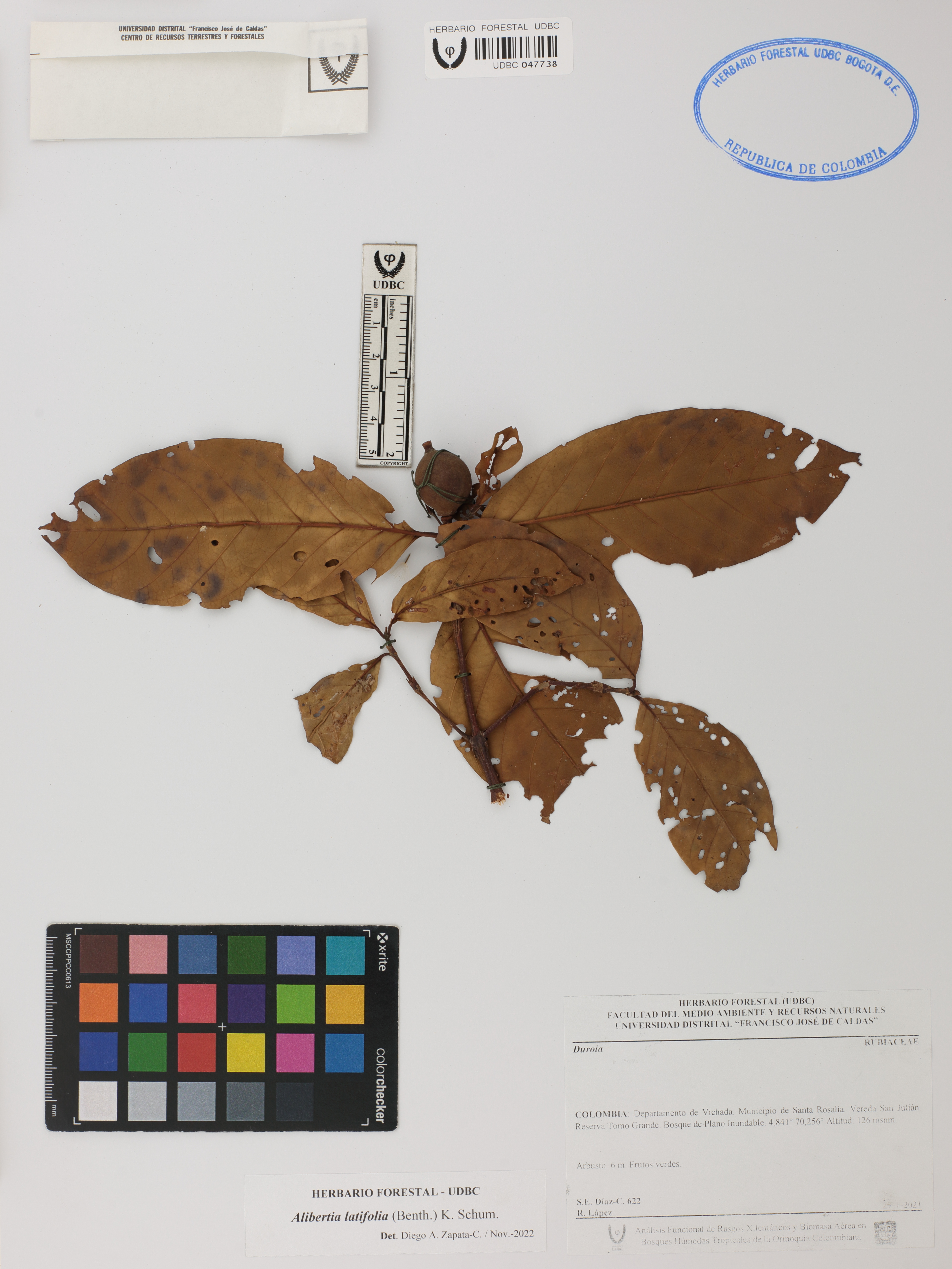 Fotografía del ejemplar Díaz-C., S. 622, determinado como Alibertia latifolia en el año 2022