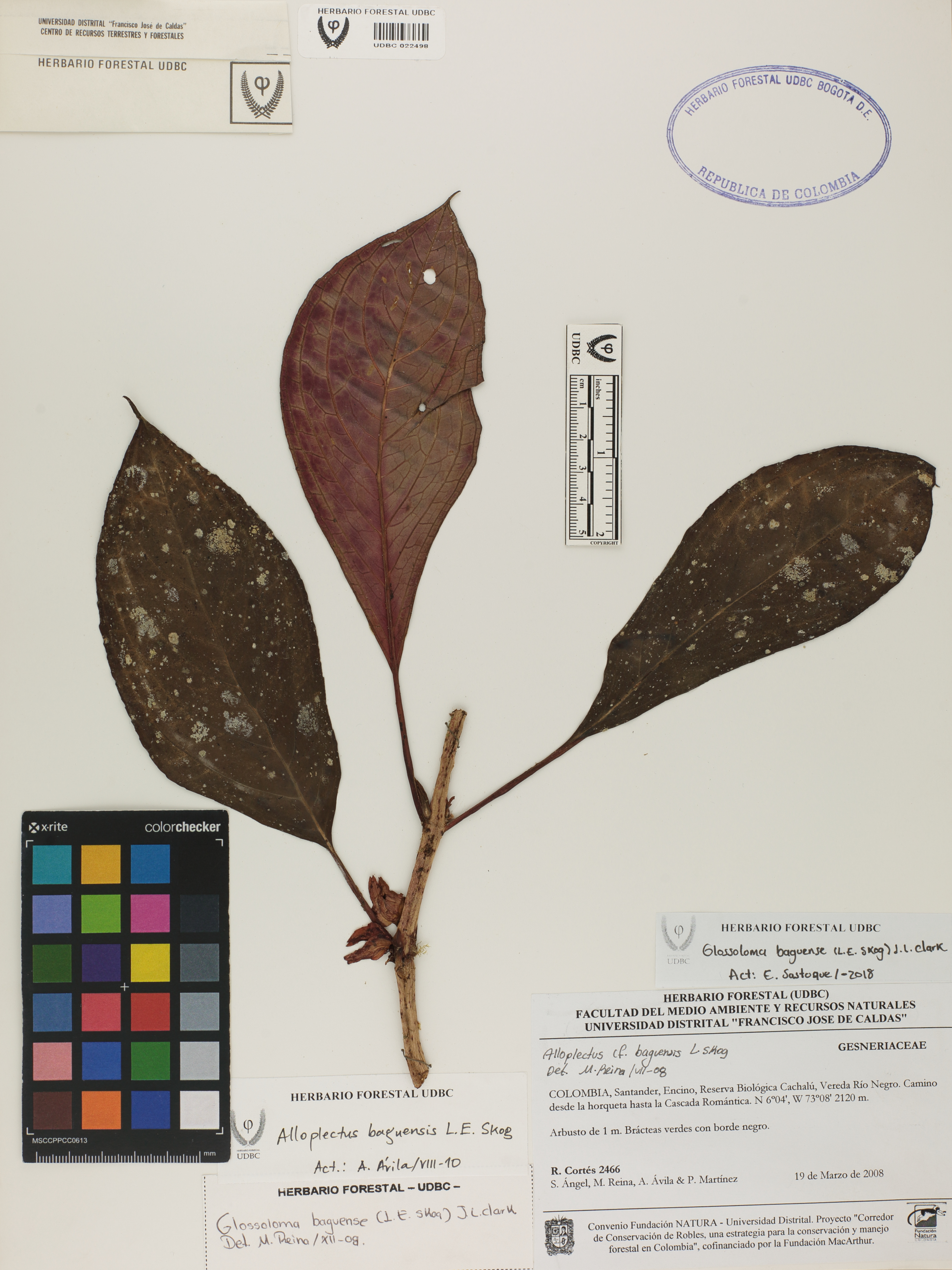 Fotografía del ejemplar Cortés, R. 2466, determinado como Glossoloma baguense en el año 2010