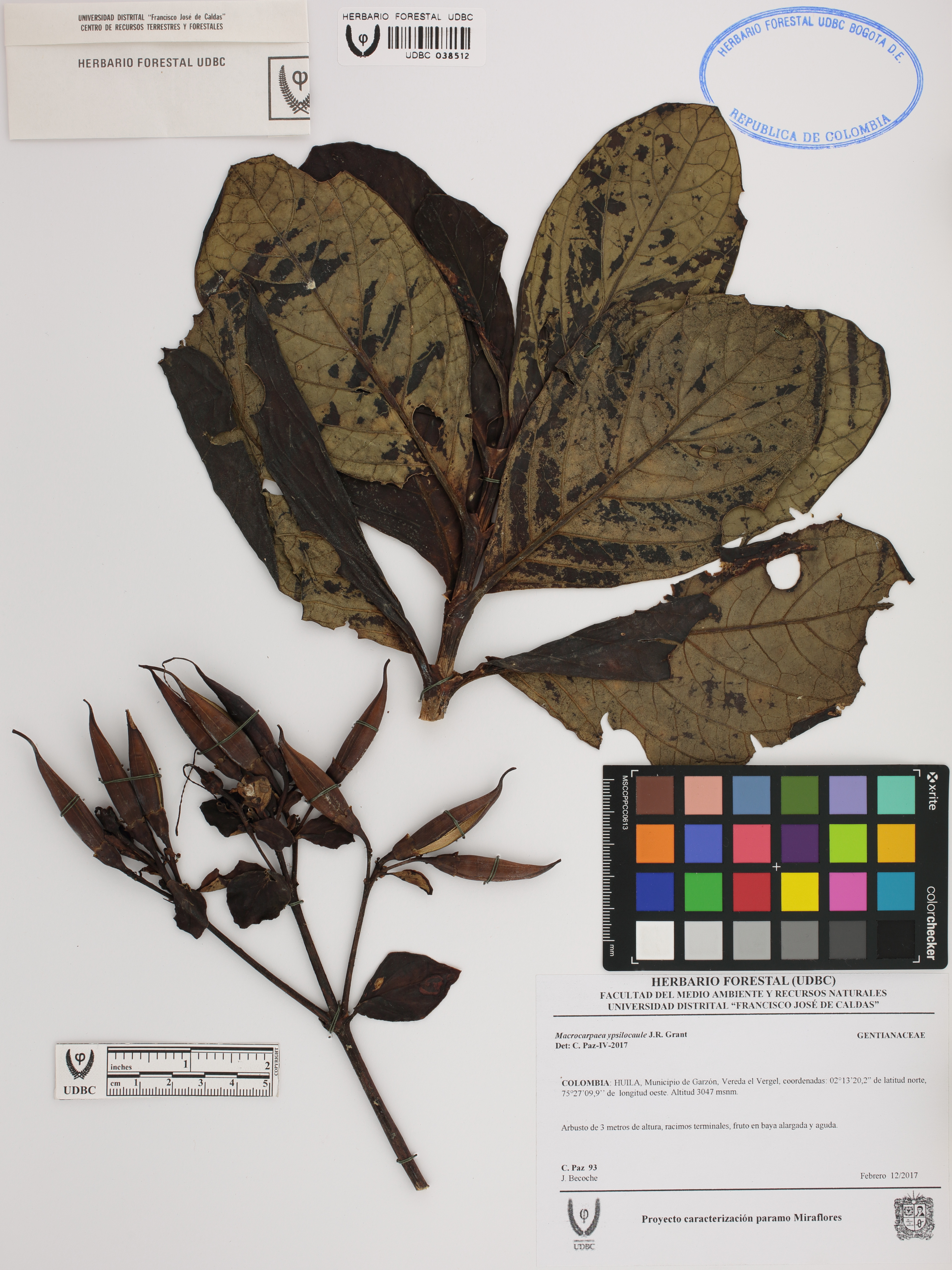 Fotografía del ejemplar Paz, C. 93, determinado como Macrocarpaea ypsilocaule en el año 2017