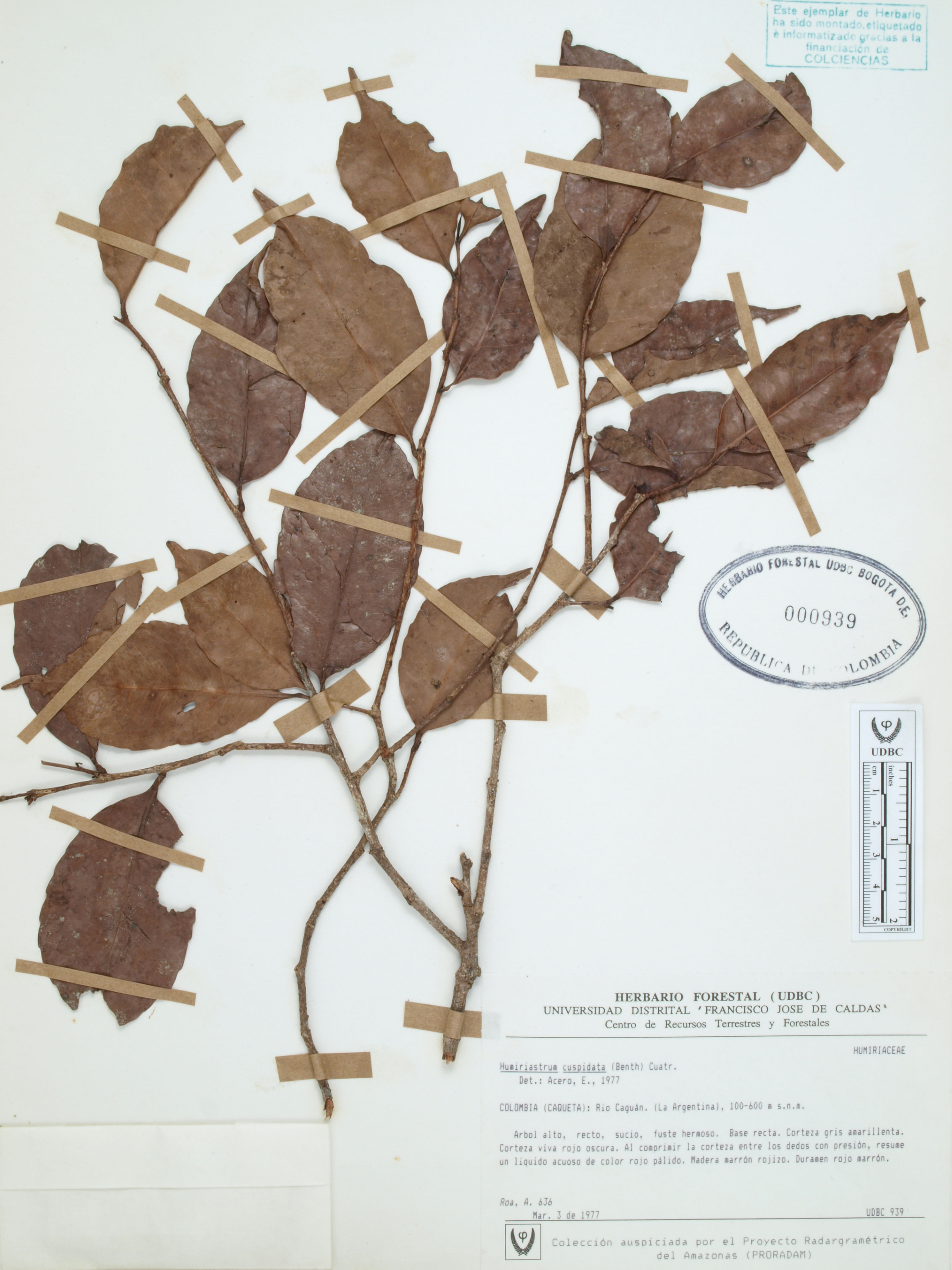 Fotografía del ejemplar Roa, A. 636, determinado como Humiriastrum cuspidatum en el año 1977