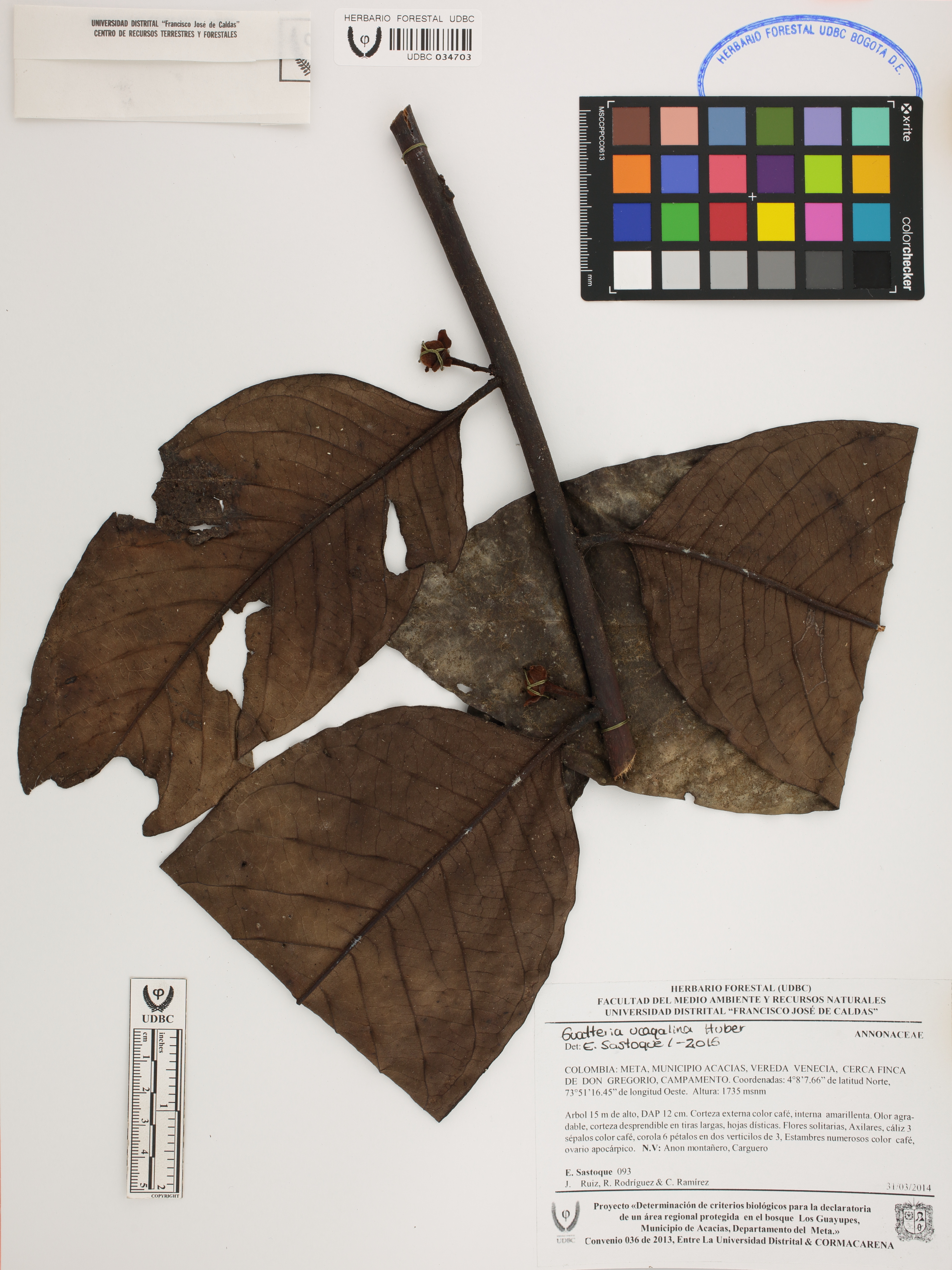 Fotografía del ejemplar Sastoque, E. 93, determinado como Guatteria ucayalina en el año 2016