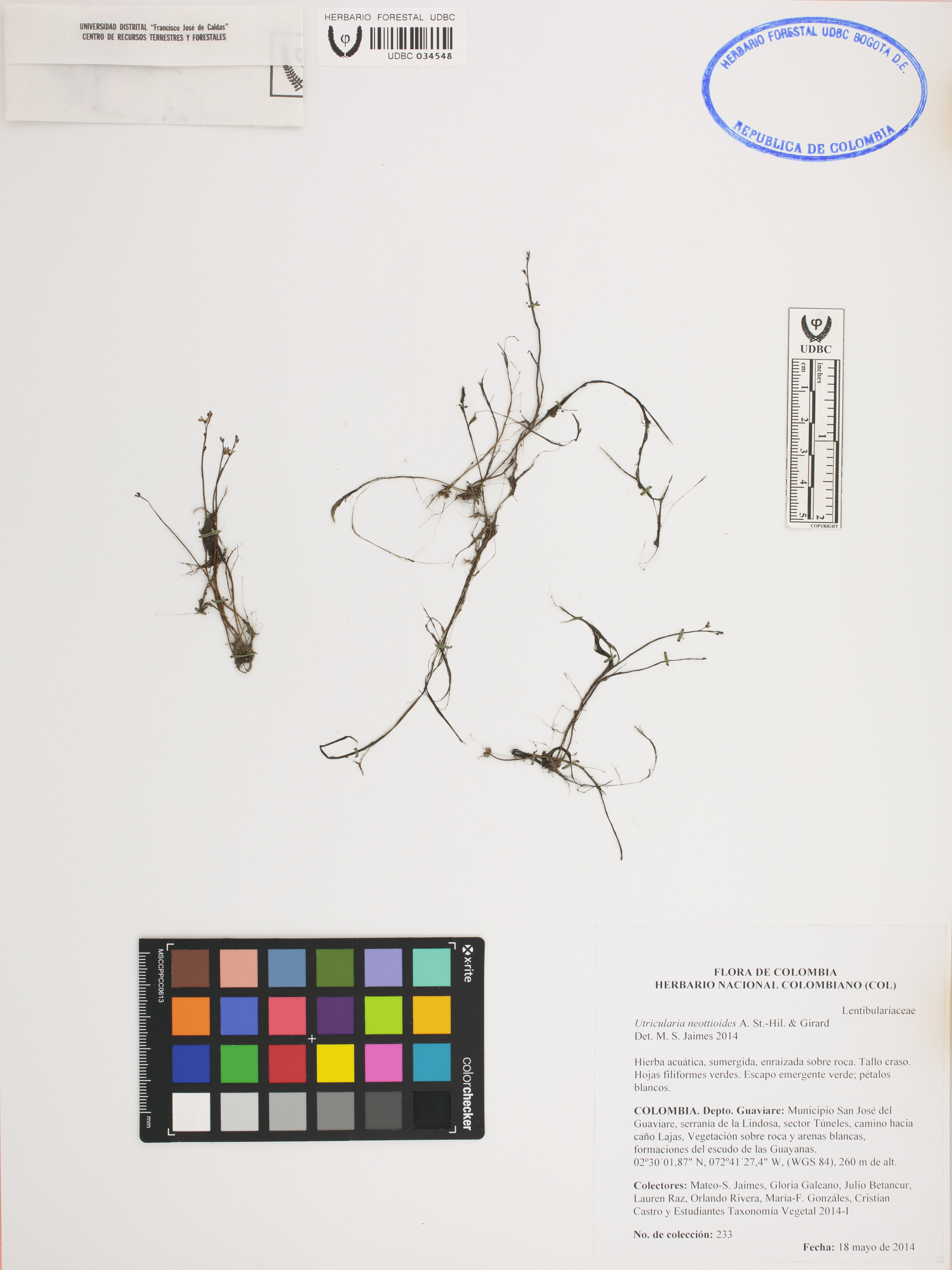 Fotografía del ejemplar Jaimes, M. 233, determinado como Utricularia neottioides en el año 2014
