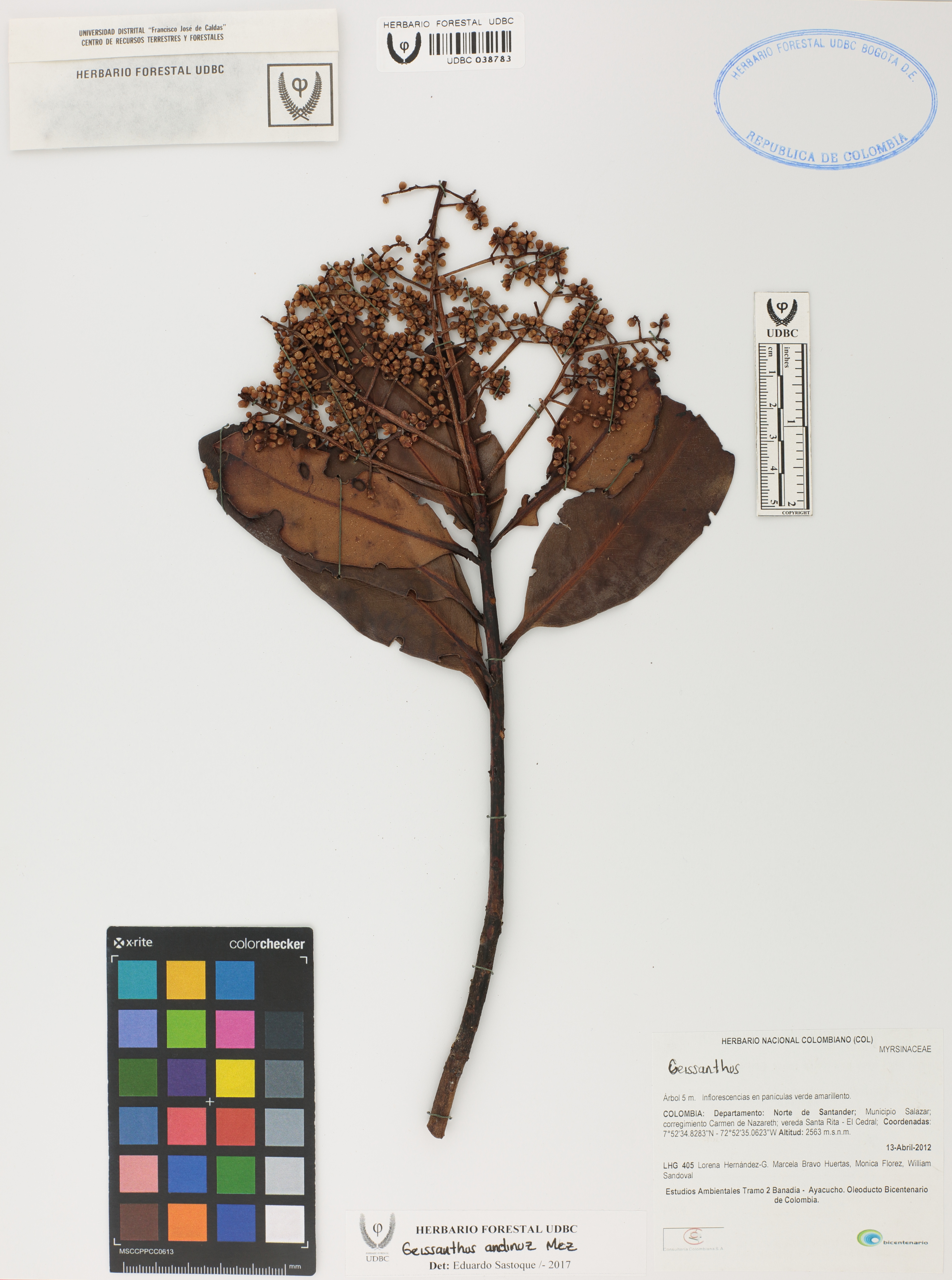 Fotografía del ejemplar Hernández-G., L. 405, determinado como Geissanthus andinus en el año 2017