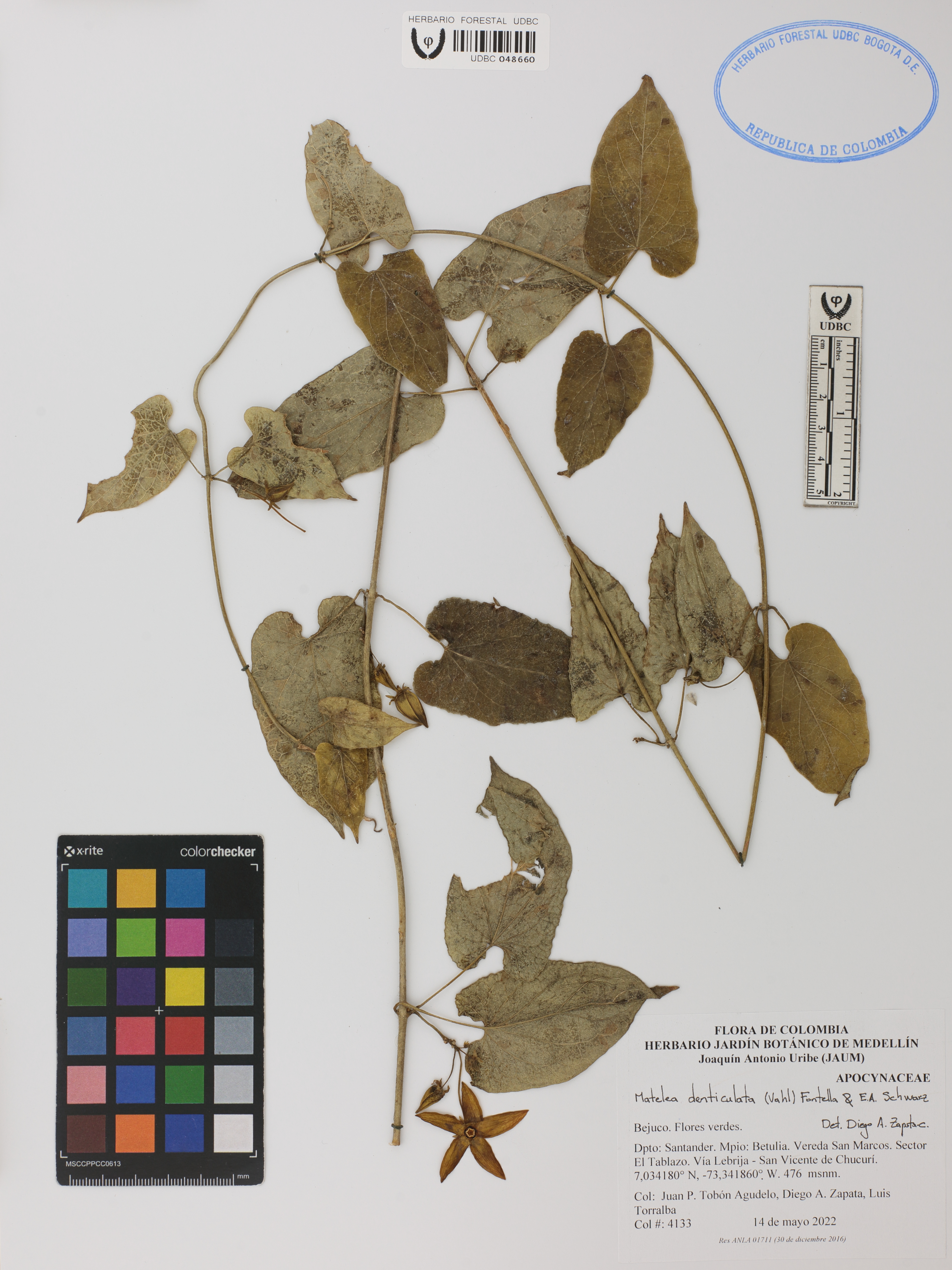Fotografía del ejemplar Tobón-A., J. 4133, determinado como Matelea denticulata en el año 2023