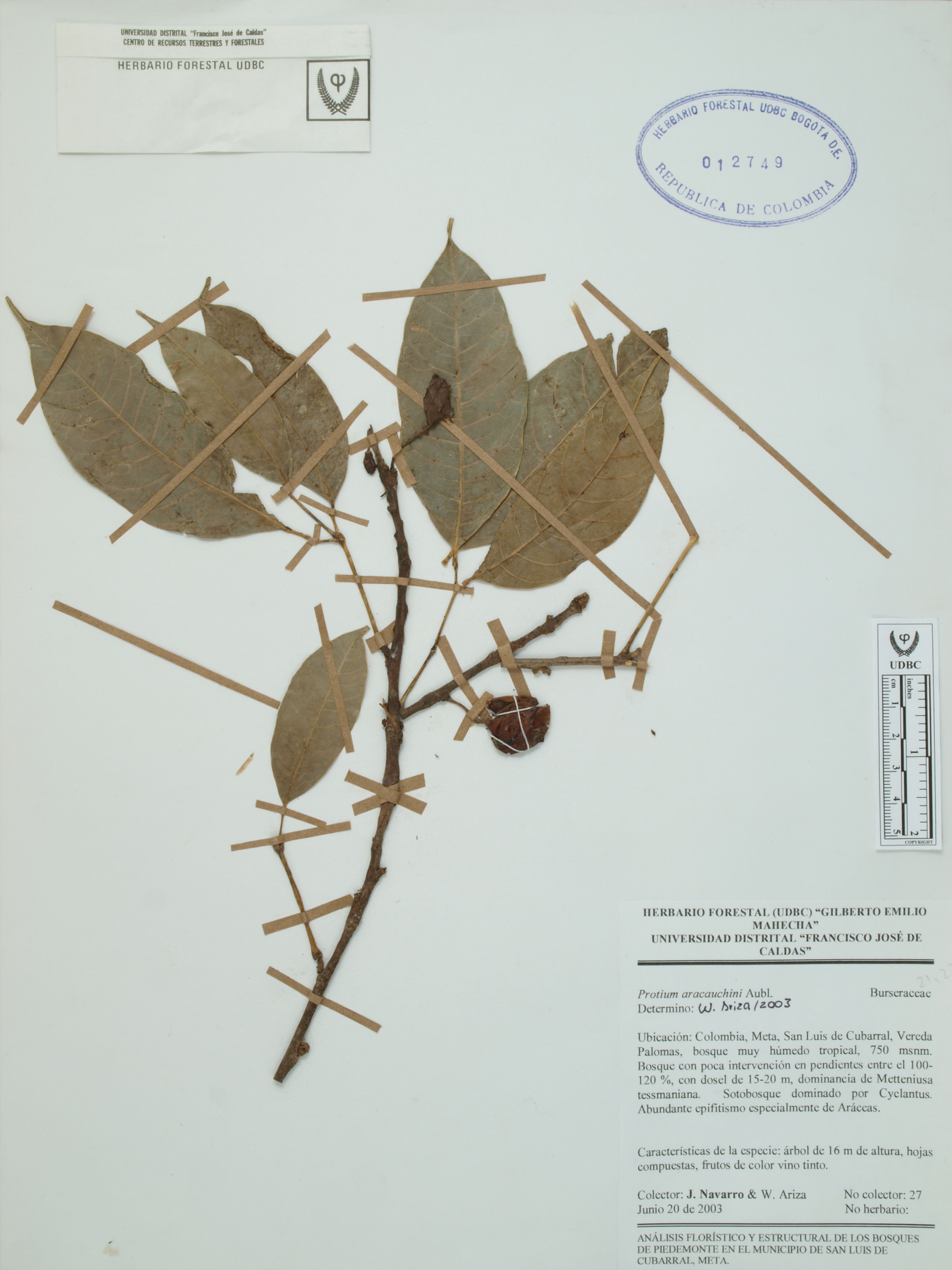 Fotografía del ejemplar Navarro, J. 27, determinado como Protium calanense en el año 2022