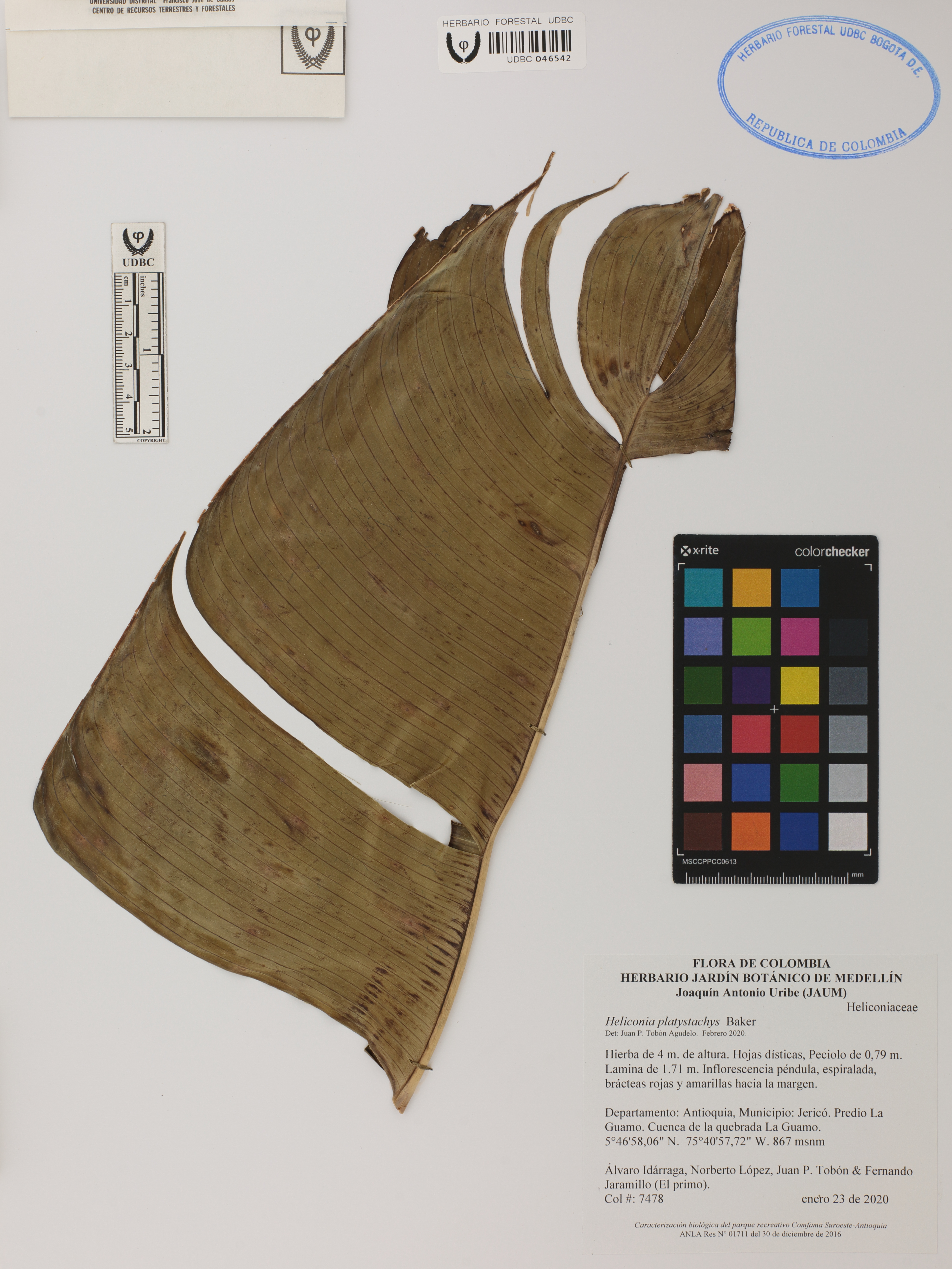 Fotografía del ejemplar Idárraga, Á. 7478, determinado como Heliconia platystachys en el año 2020