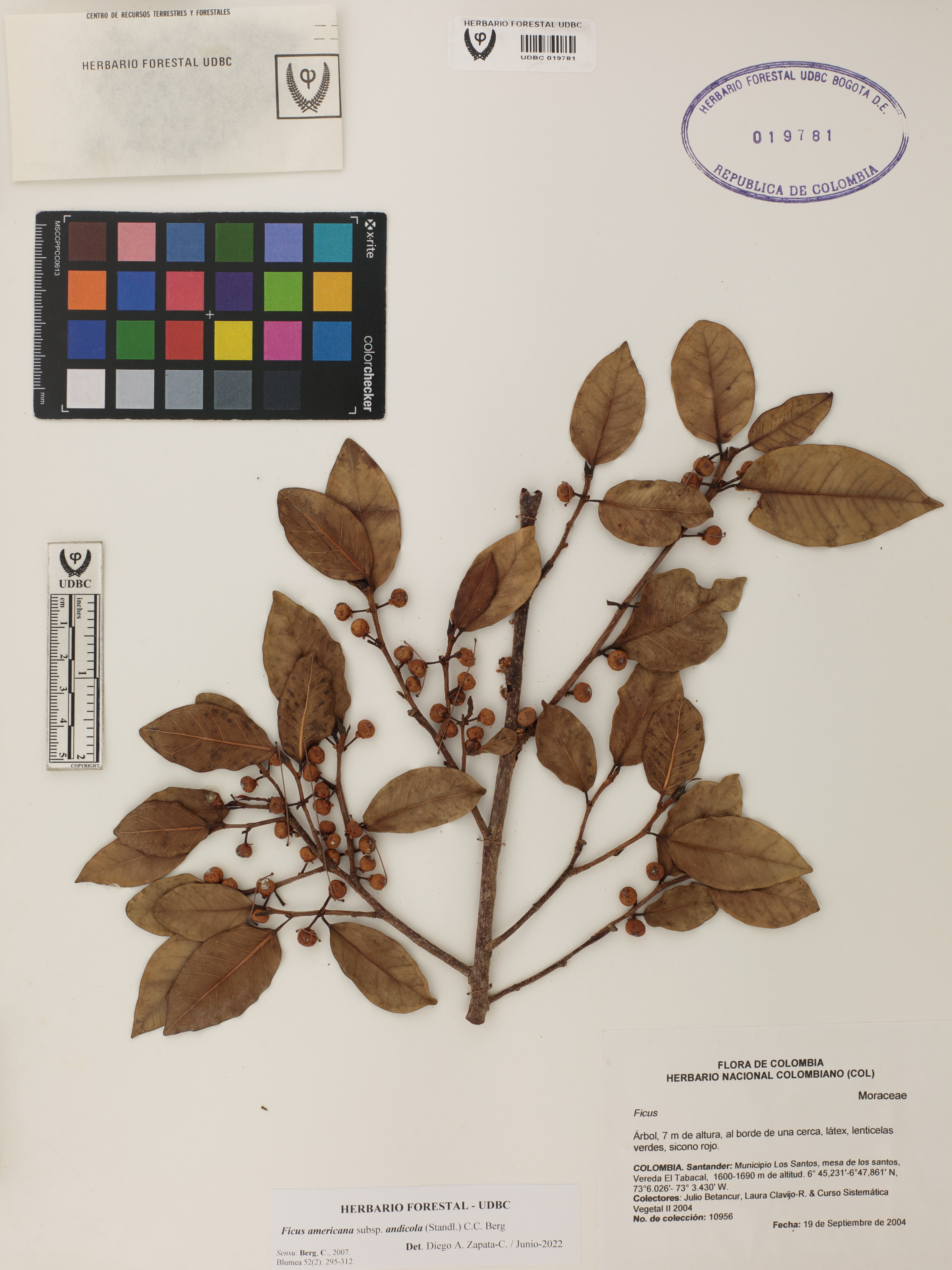 Fotografía del ejemplar Betancur, J. 10956, determinado como Ficus americana subsp. andicola en el año 2022
