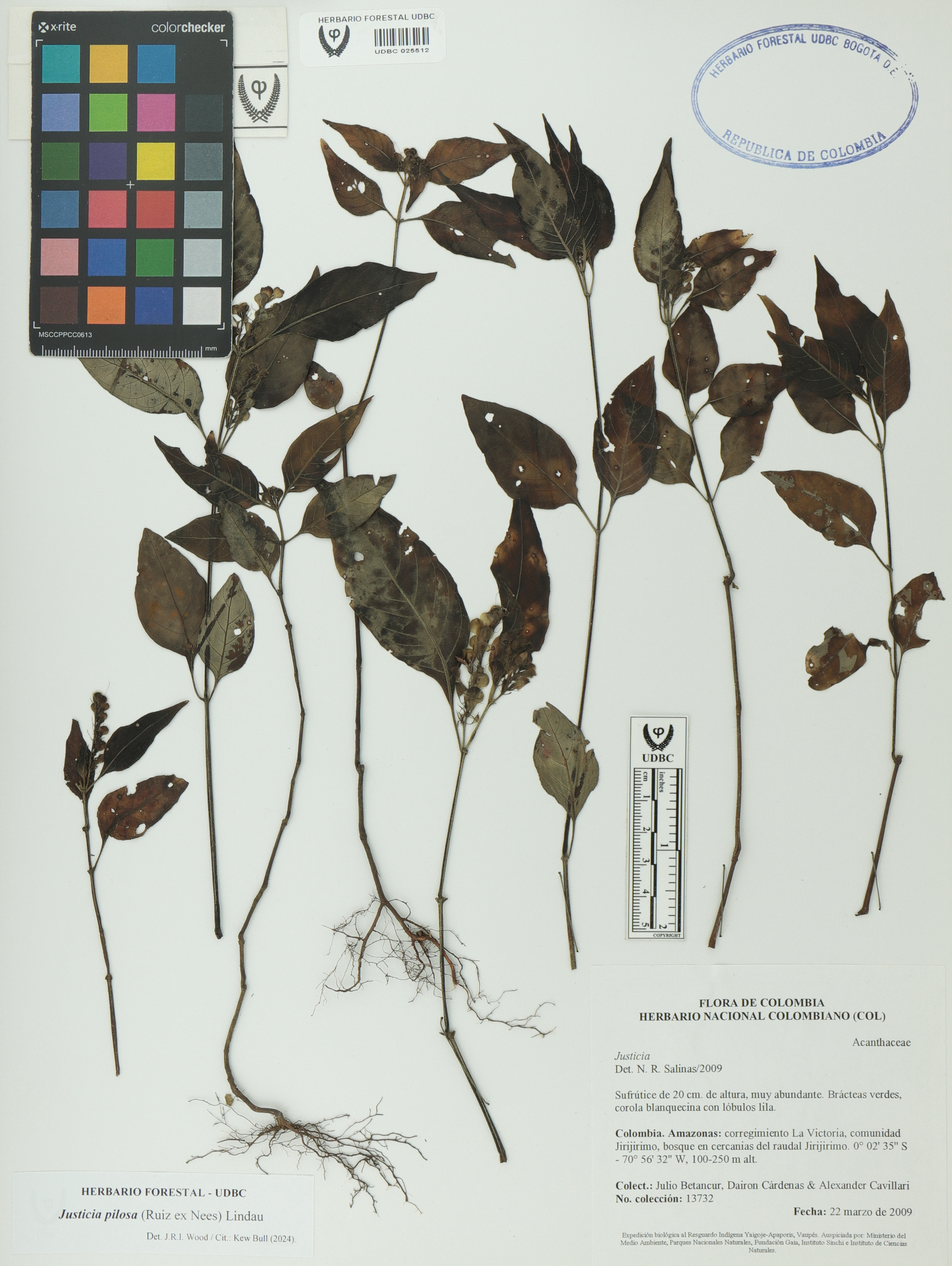 Fotografía del ejemplar Betancur, J. 13732, determinado como Justicia pilosa en el año 2024