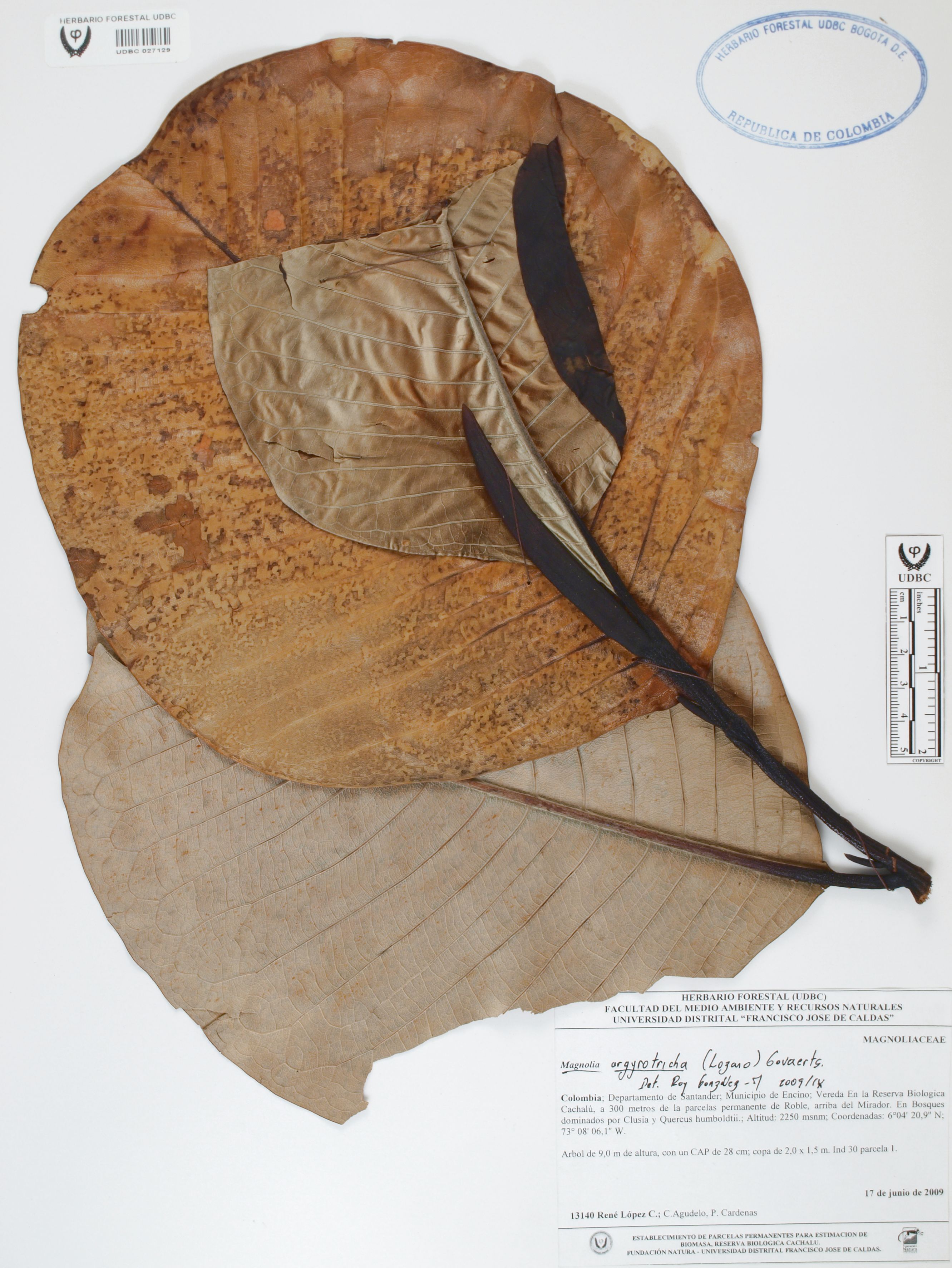 Fotografía del ejemplar López, R. 13140, determinado como Magnolia argyrothricha en el año 2009