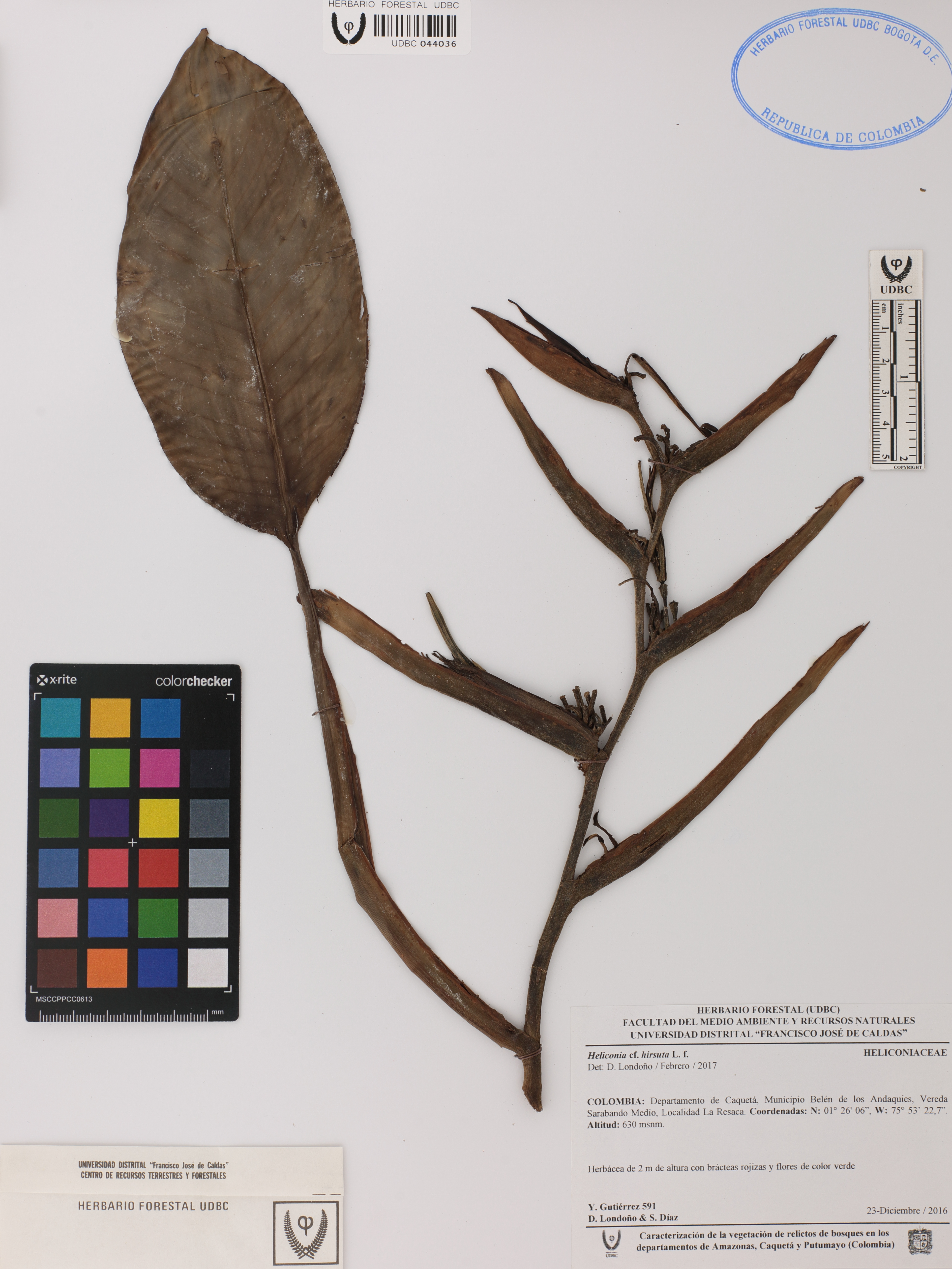 Fotografía del ejemplar Gutiérrez, Y. 591, determinado como Heliconia hirsuta en el año 2017