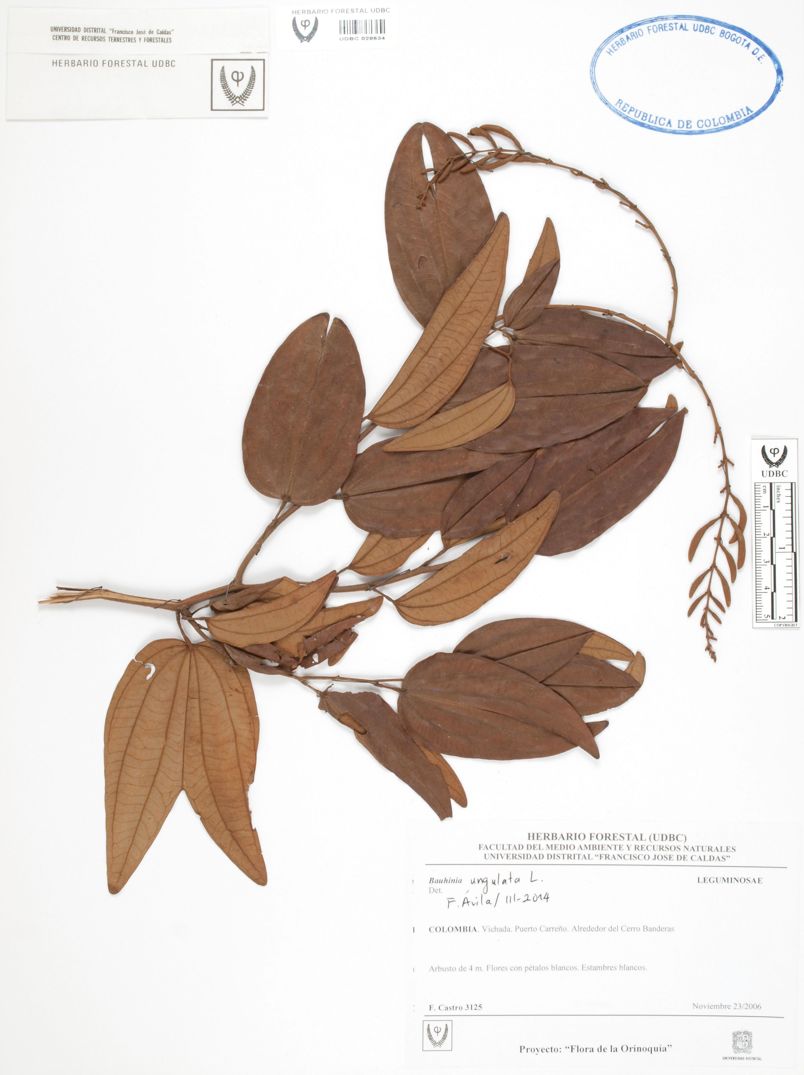 Fotografía del ejemplar Castro, F. 3125, determinado como Bauhinia ungulata en el año 2014