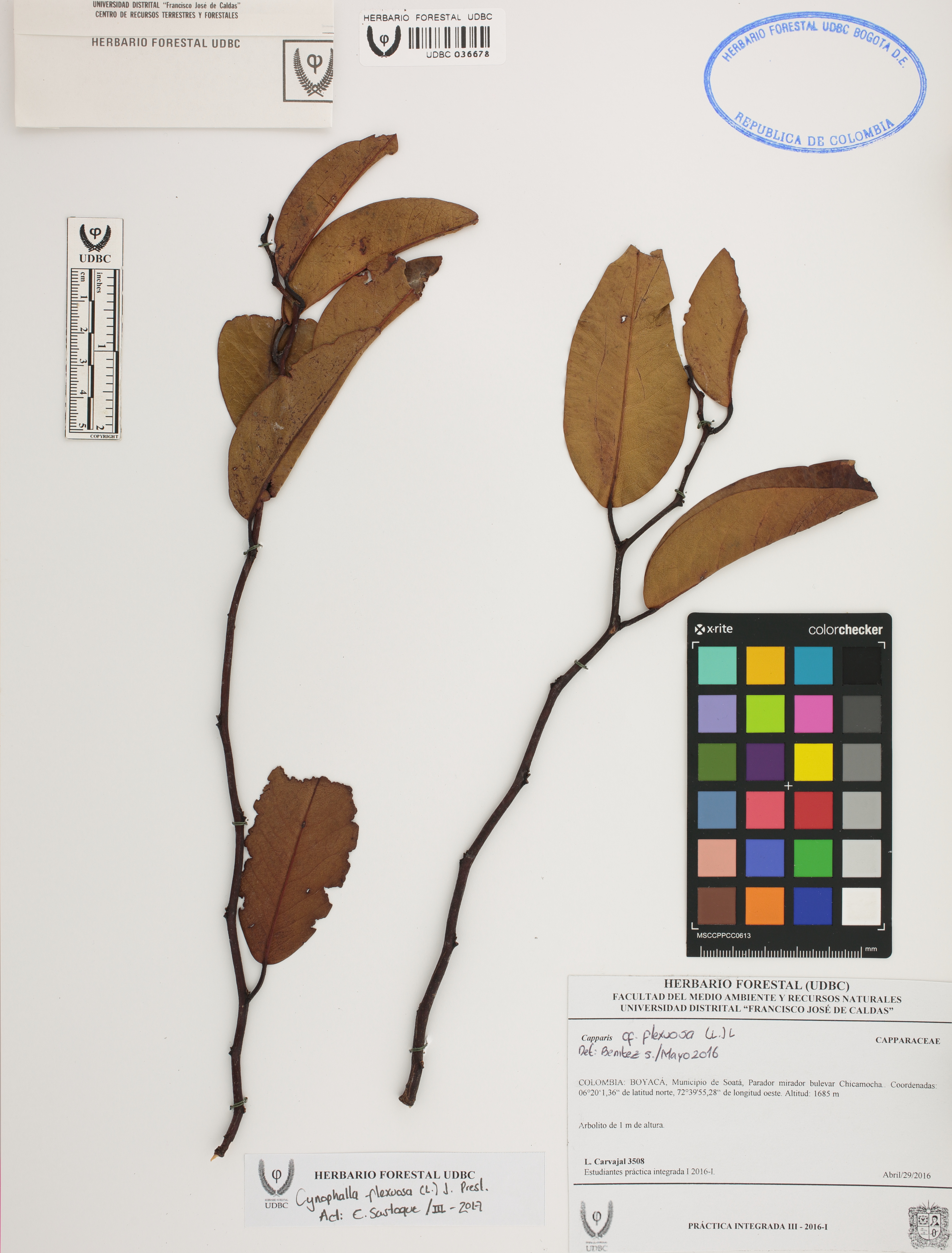 Fotografía del ejemplar Carvajal, L. 3508, determinado como Cynophalla flexuosa en el año 2016