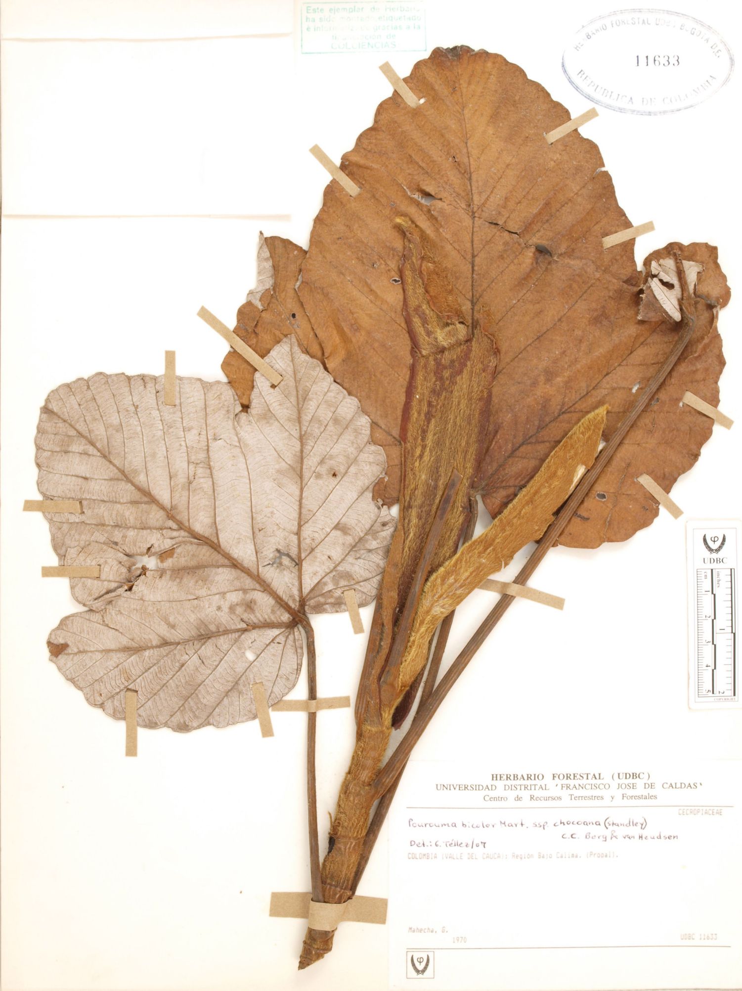 Fotografía del ejemplar Mahecha, G., determinado como Pourouma bicolor subsp. chocoana en el año 2007