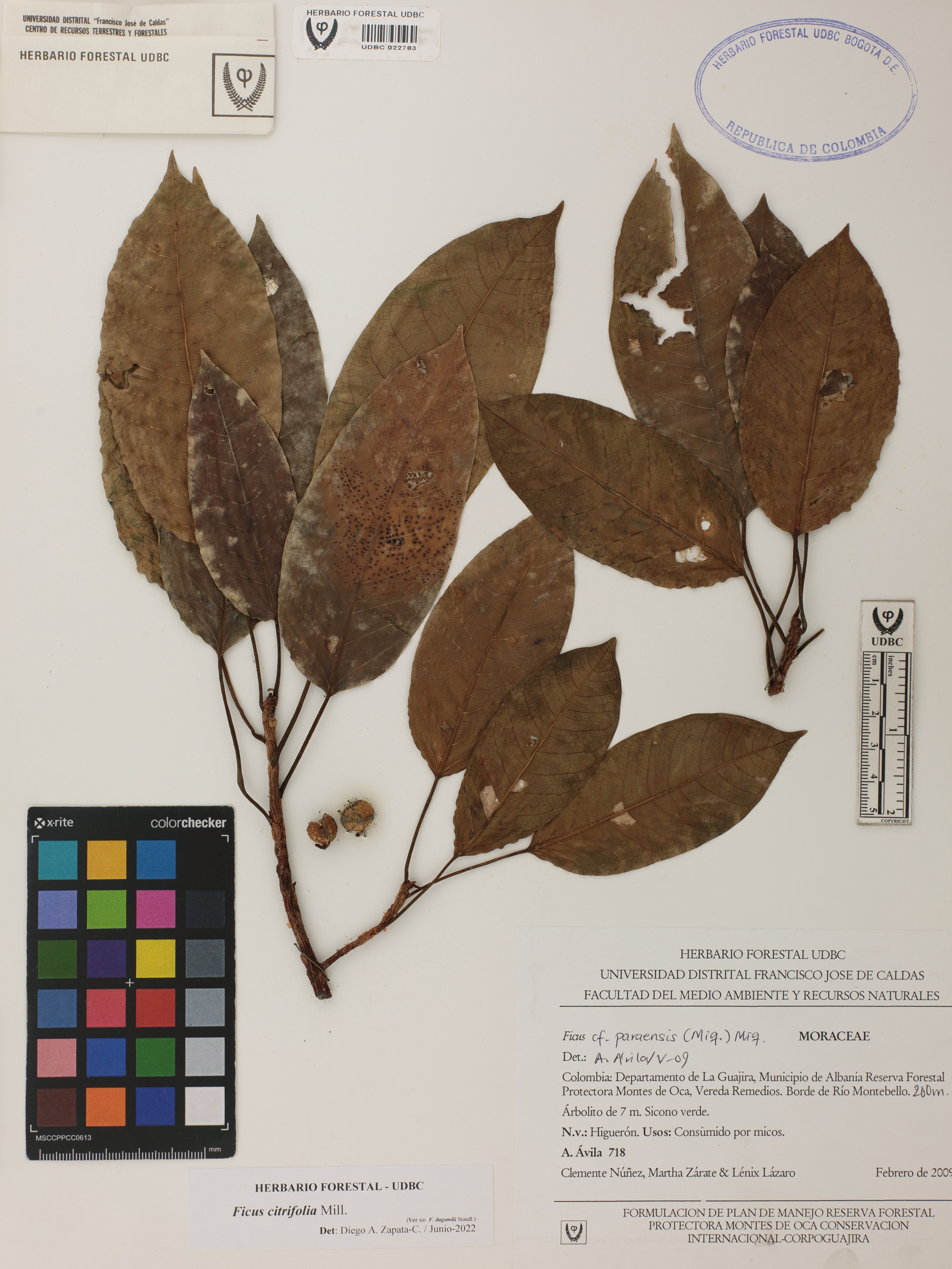 Fotografía del ejemplar Ávila, F. 718, determinado como Ficus citrifolia en el año 2022
