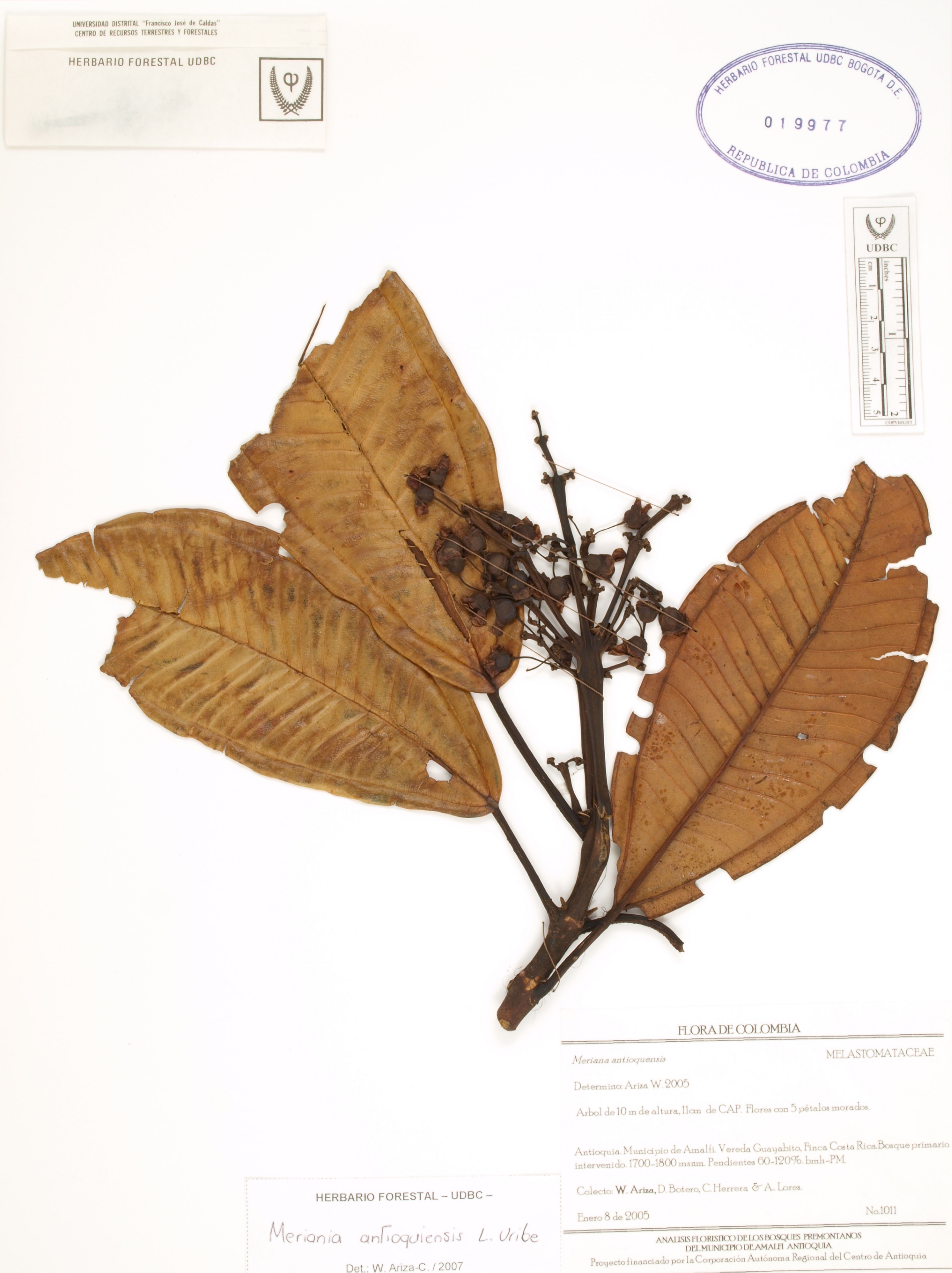| dc.description | Fotografía del ejemplar Ariza, W. 1011, determinado como Meriania antioquiensis en el año 2007 | |