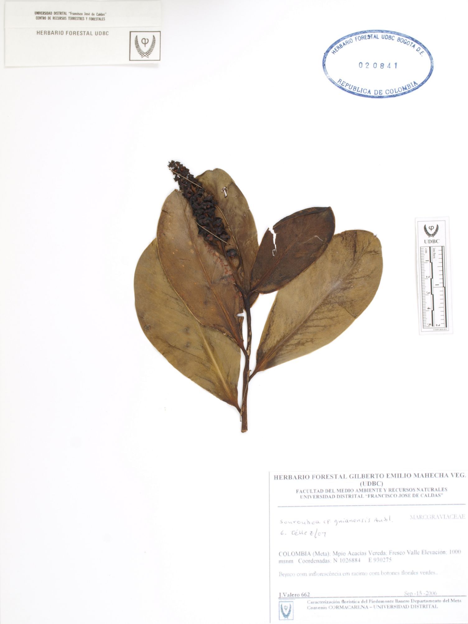 Fotografía del ejemplar Valero, J. 662, determinado como Souroubea guianensis en el año 2007