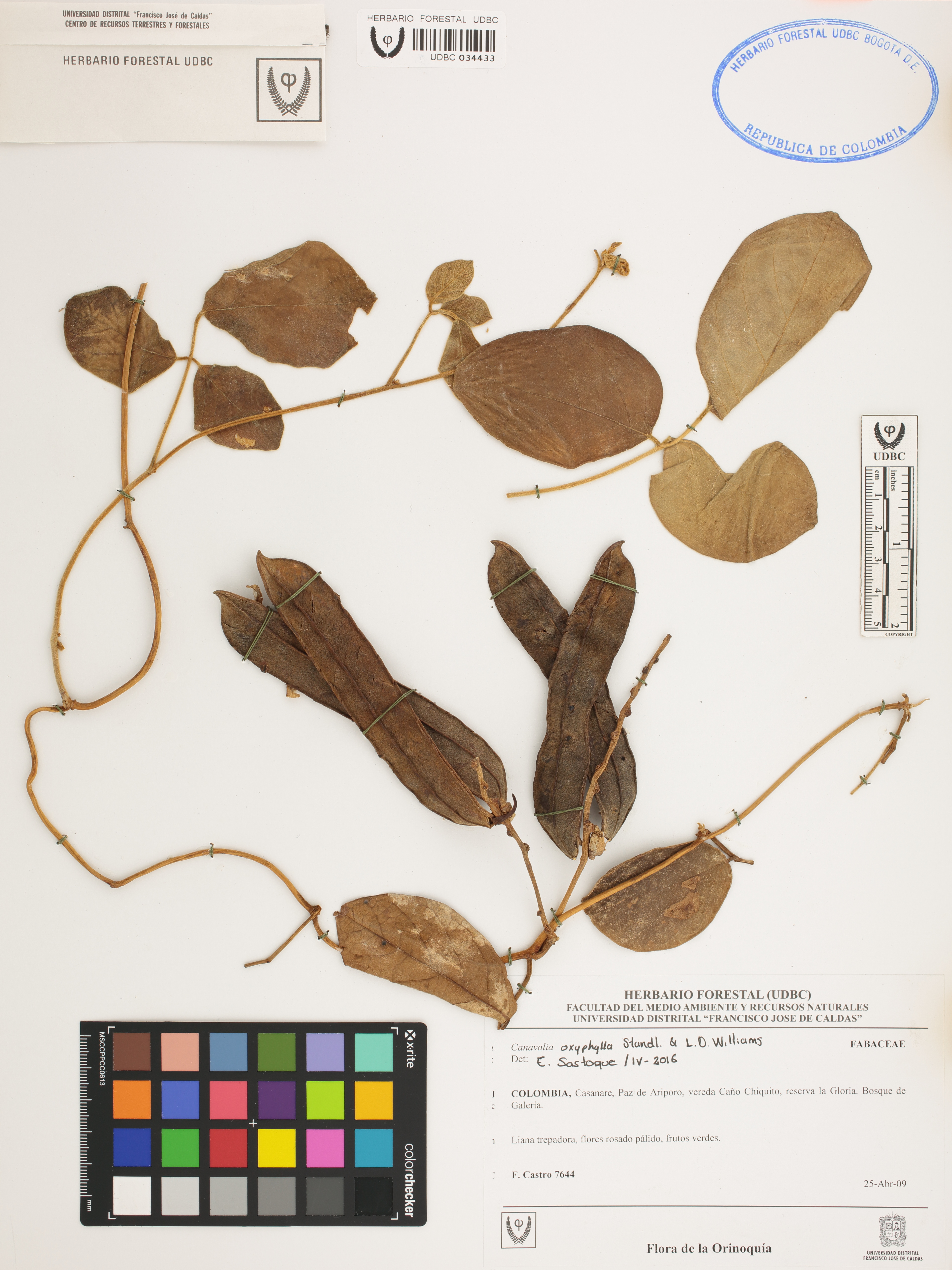 Fotografía del ejemplar Castro, F. 7644, determinado como Canavalia oxyphylla en el año 2016