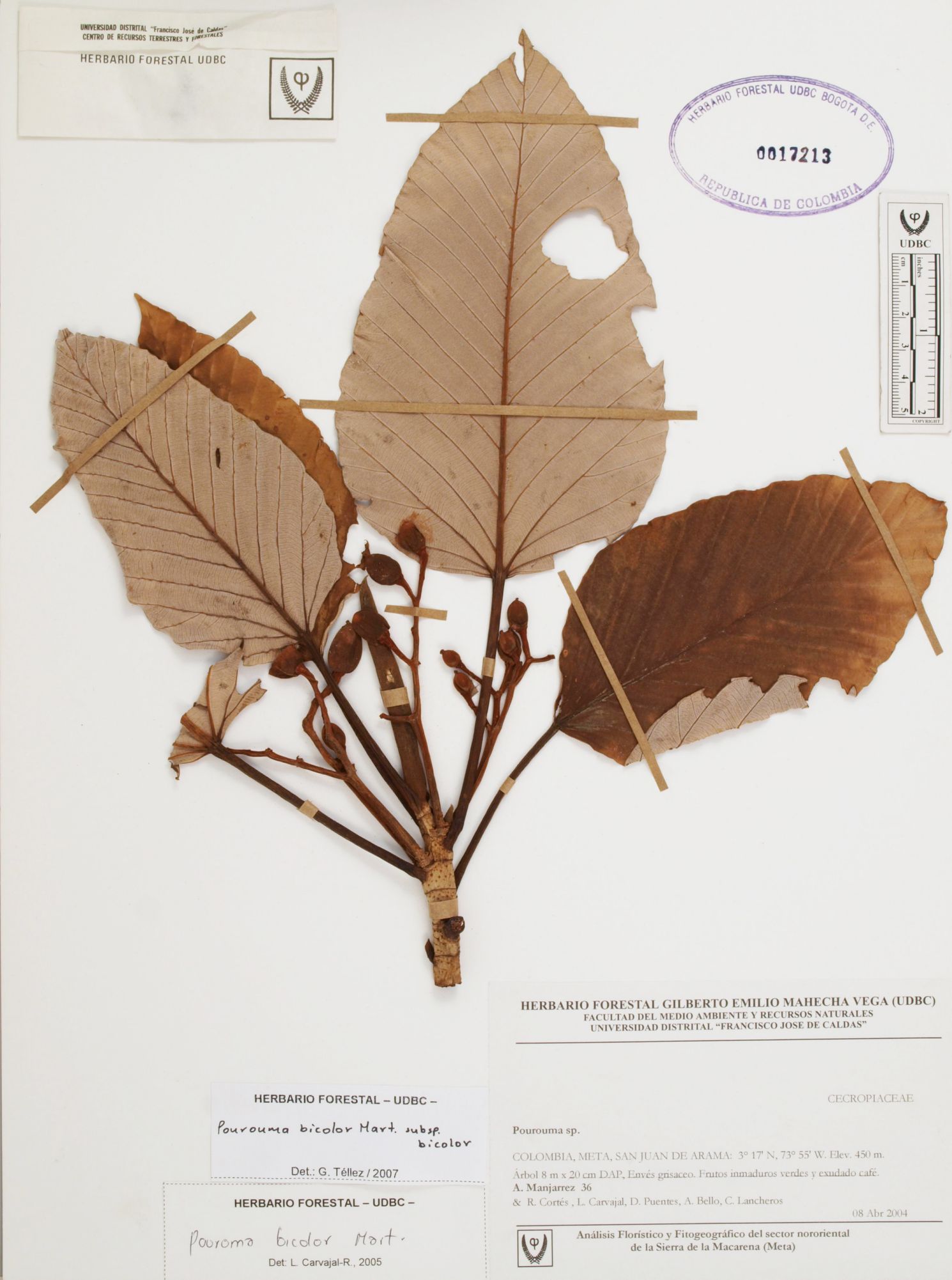 Fotografía del ejemplar Manjarrez, A. 36, determinado como Pourouma bicolor subsp. bicolor en el año 2007