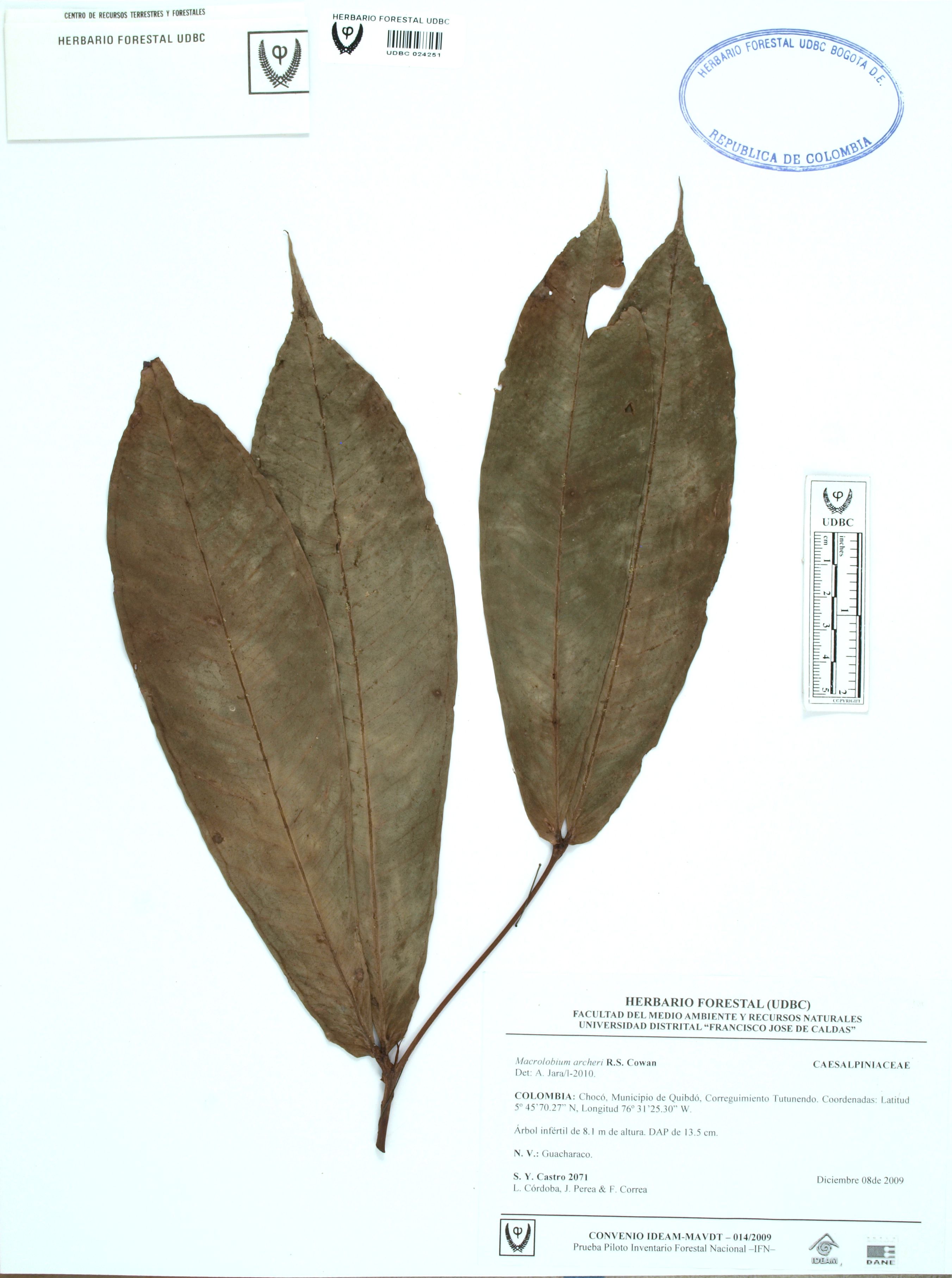 | dc.description | Fotografía del ejemplar Castro, S. 2071, determinado como Macrolobium archeri en el año 2010 | |