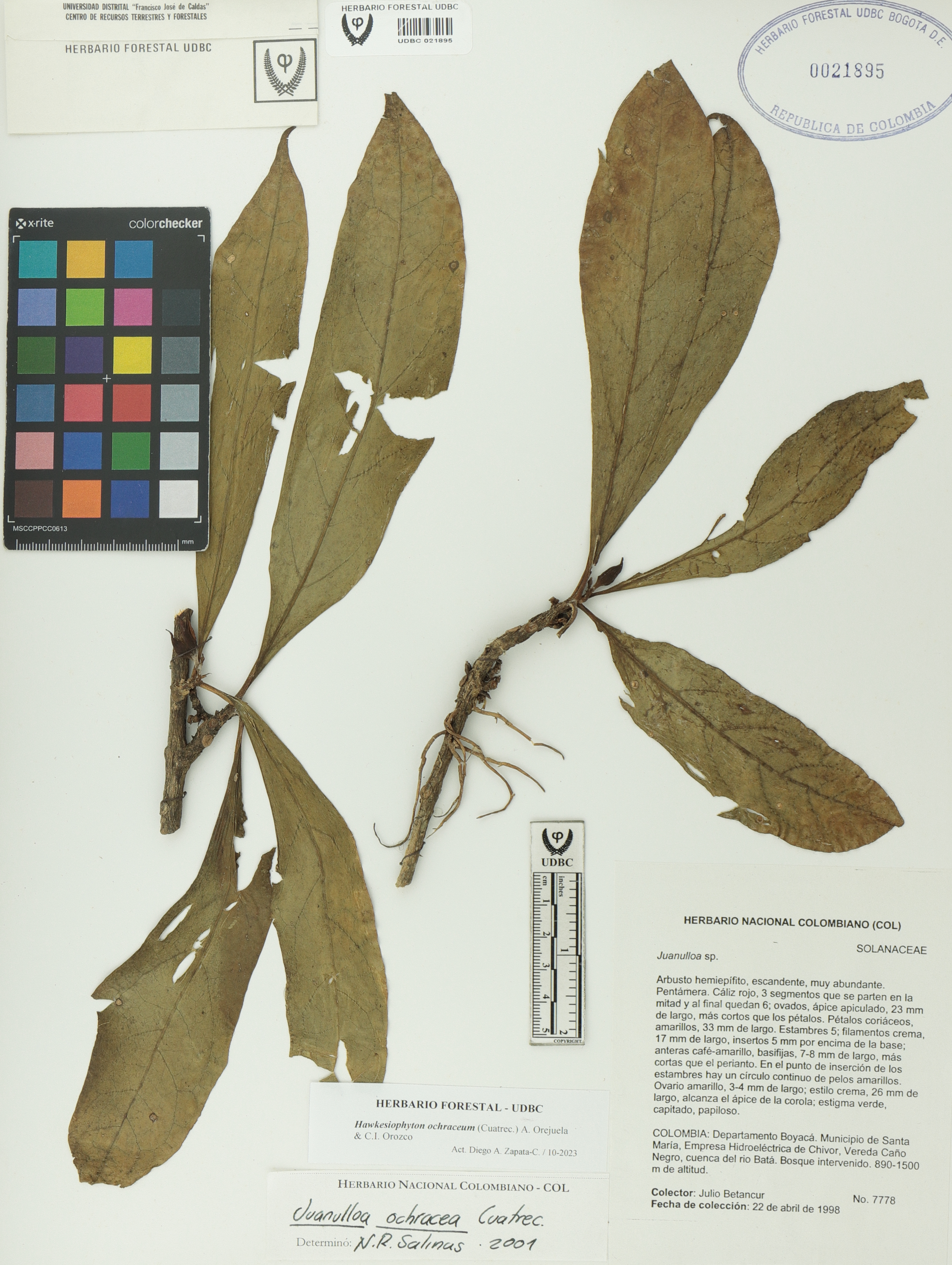 Fotografía del ejemplar Betancur, J. 7778, determinado como Hawkesiophyton ochraceum en el año 2001