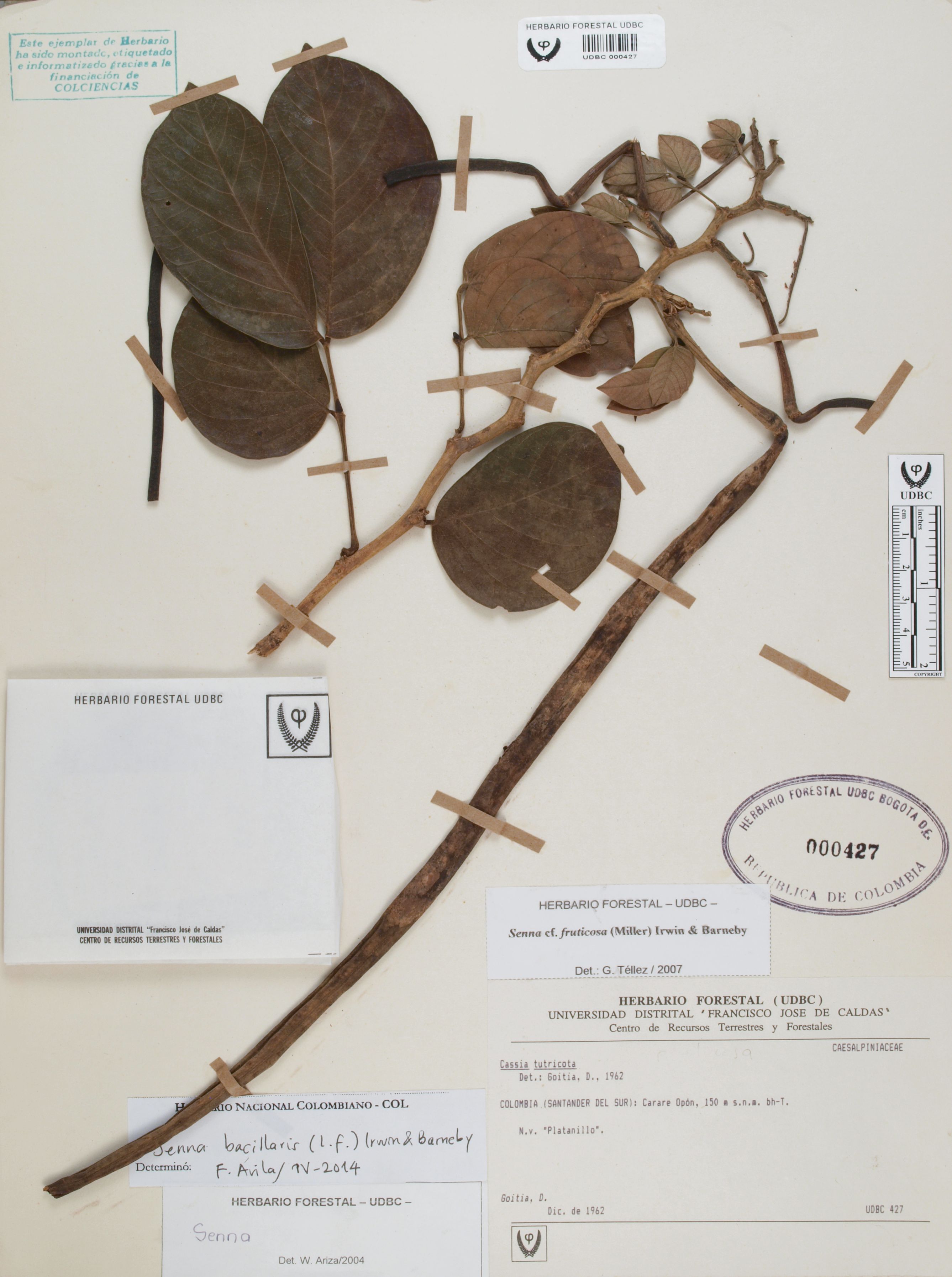 Fotografía del ejemplar Goitia, D., determinado como Senna bacillaris en el año 2014
