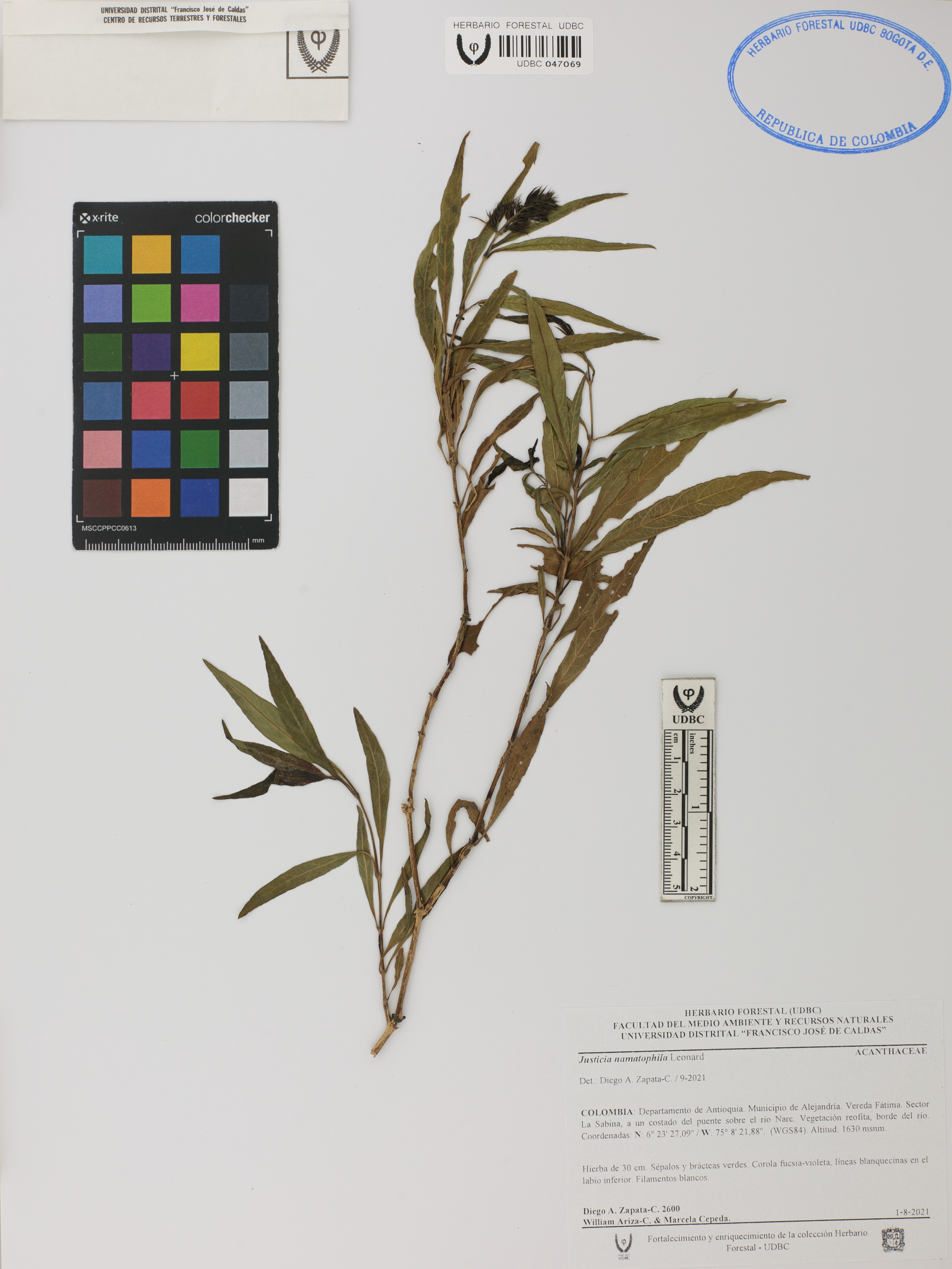 Fotografía del ejemplar Zapata-C., D. 2600, determinado como Justicia namatophila en el año 2021