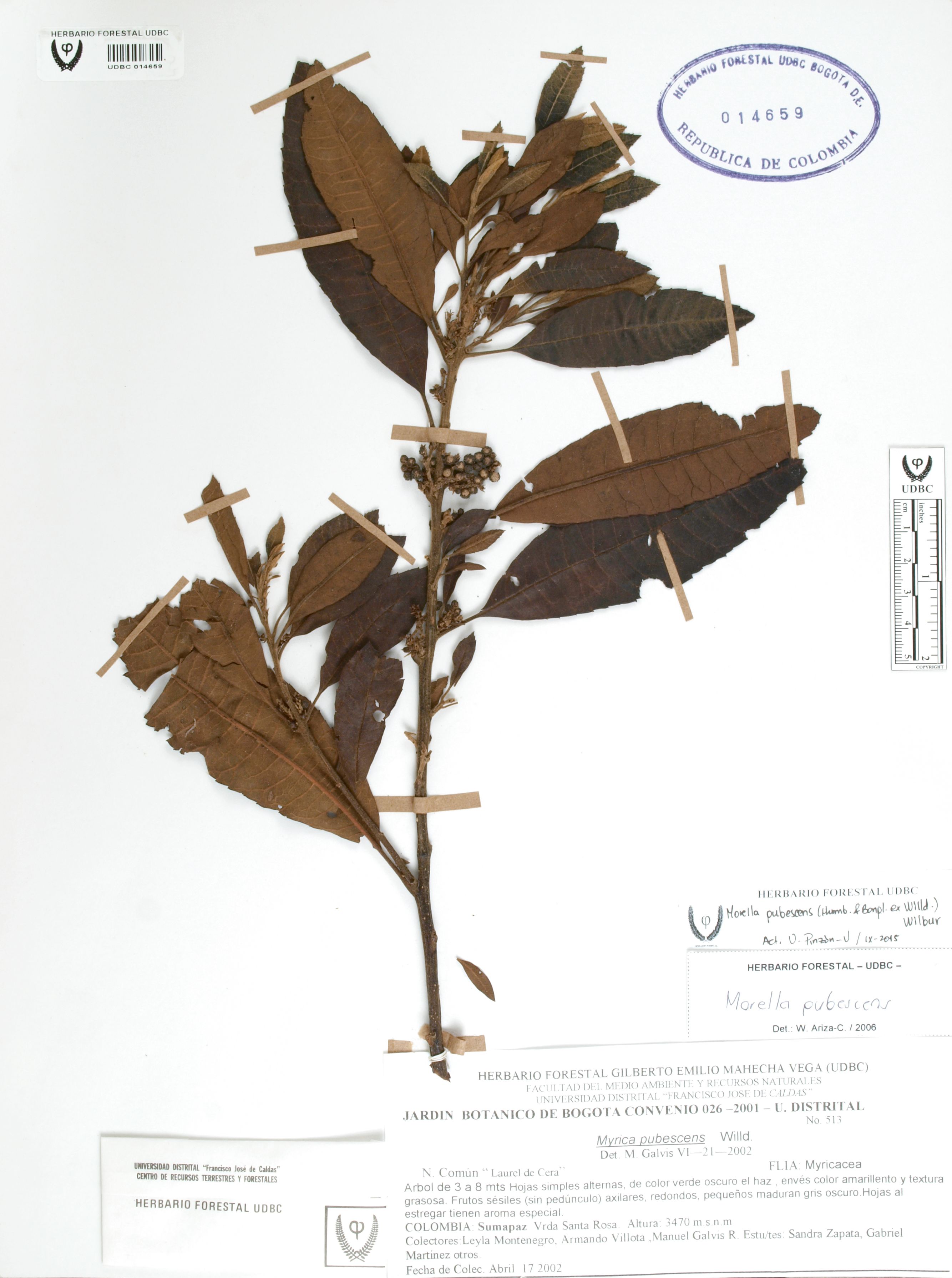 Fotografía del ejemplar Montenegro, L. 513, determinado como Morella pubescens en el año 2015