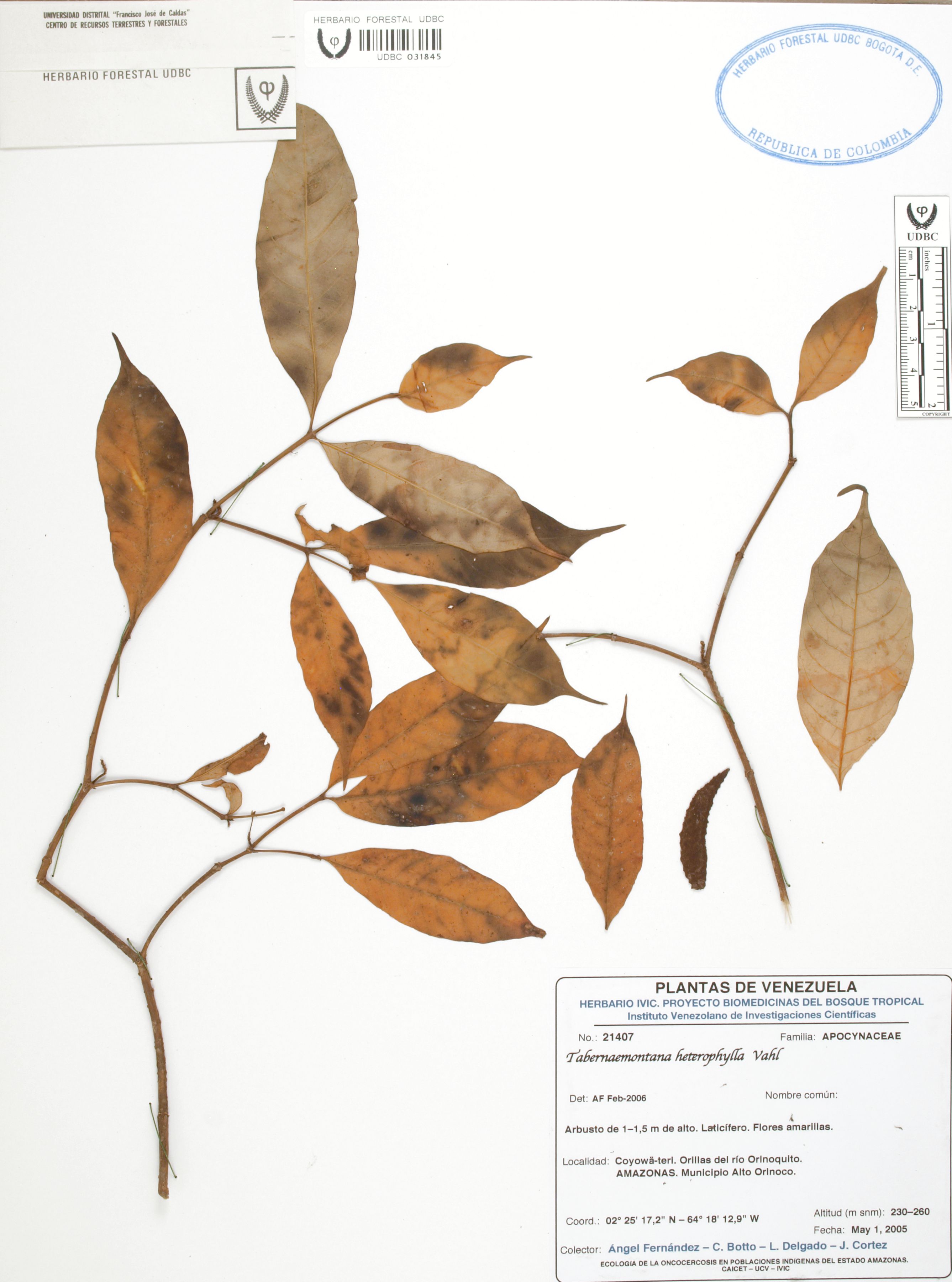 Fotografía del ejemplar Fernández, A. 21407, determinado como Tabernaemontana heterophylla en el año 2006