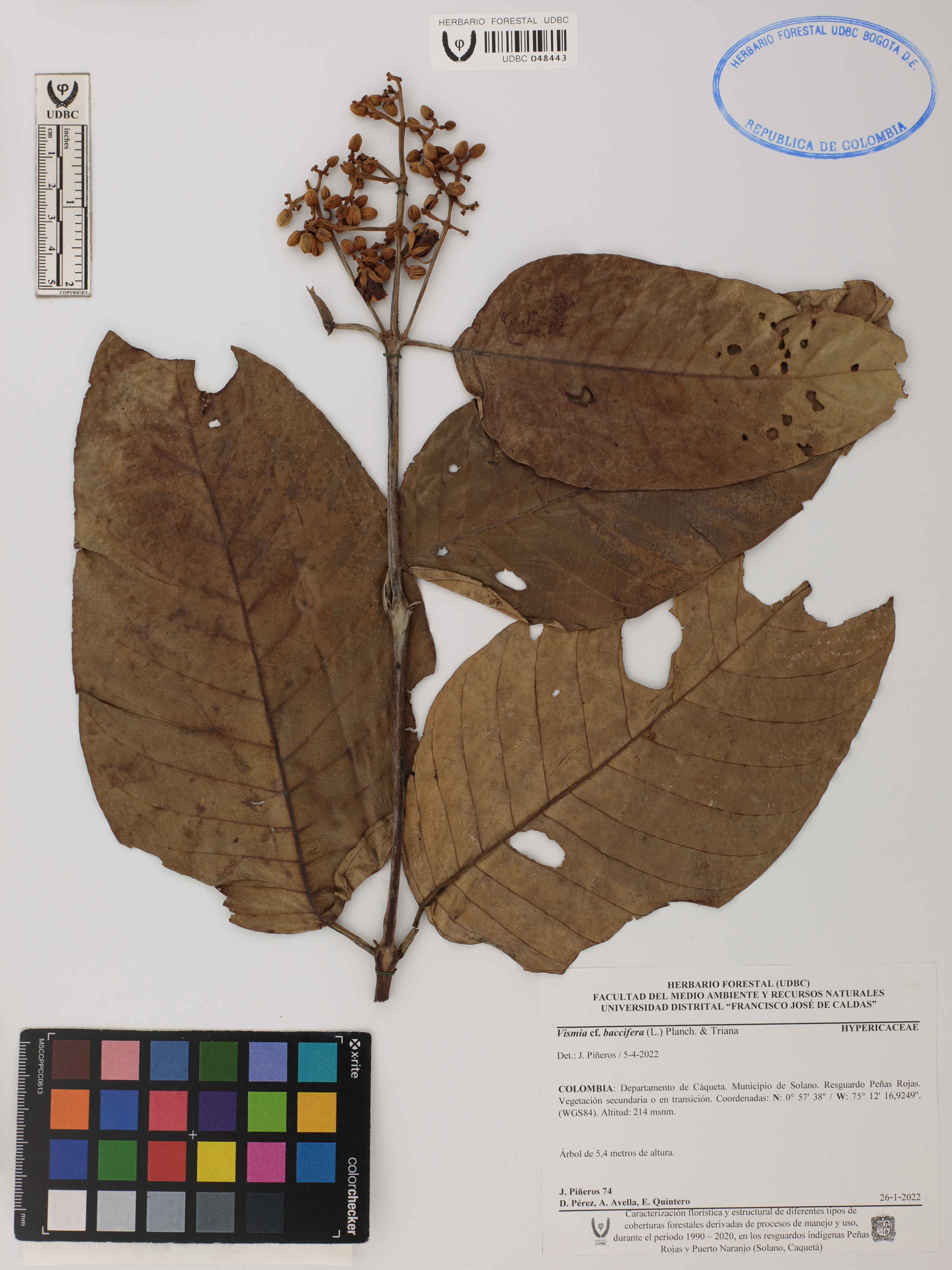 Fotografía del ejemplar Piñeros, J. 74, determinado como Vismia baccifera en el año 2022