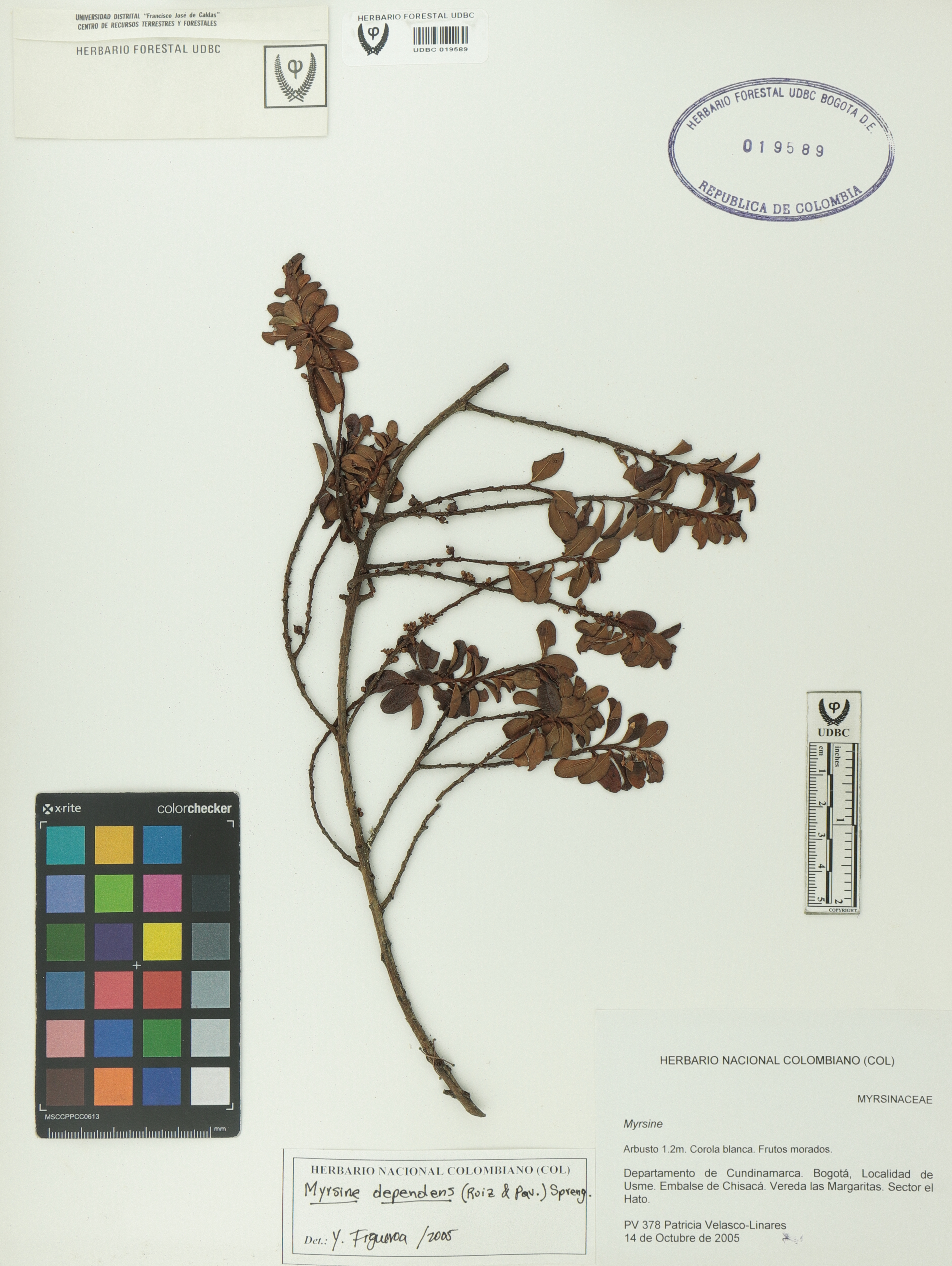| dc.description | Fotografía del ejemplar Velasco, L. 378, determinado como Myrsine dependens en el año 2005 | |