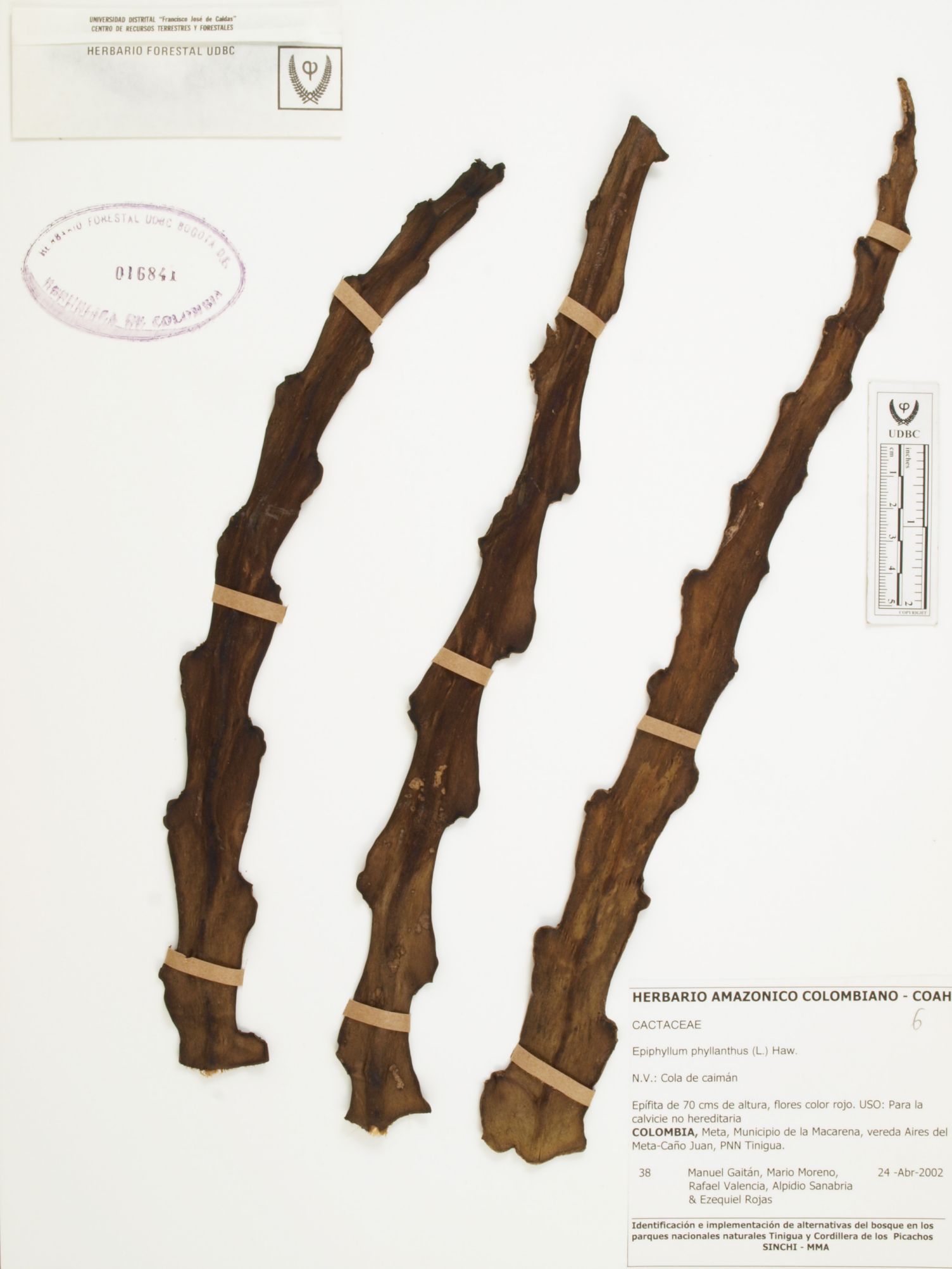 Fotografía del ejemplar Gaitán, M. 38, determinado como Epiphyllum phyllanthus