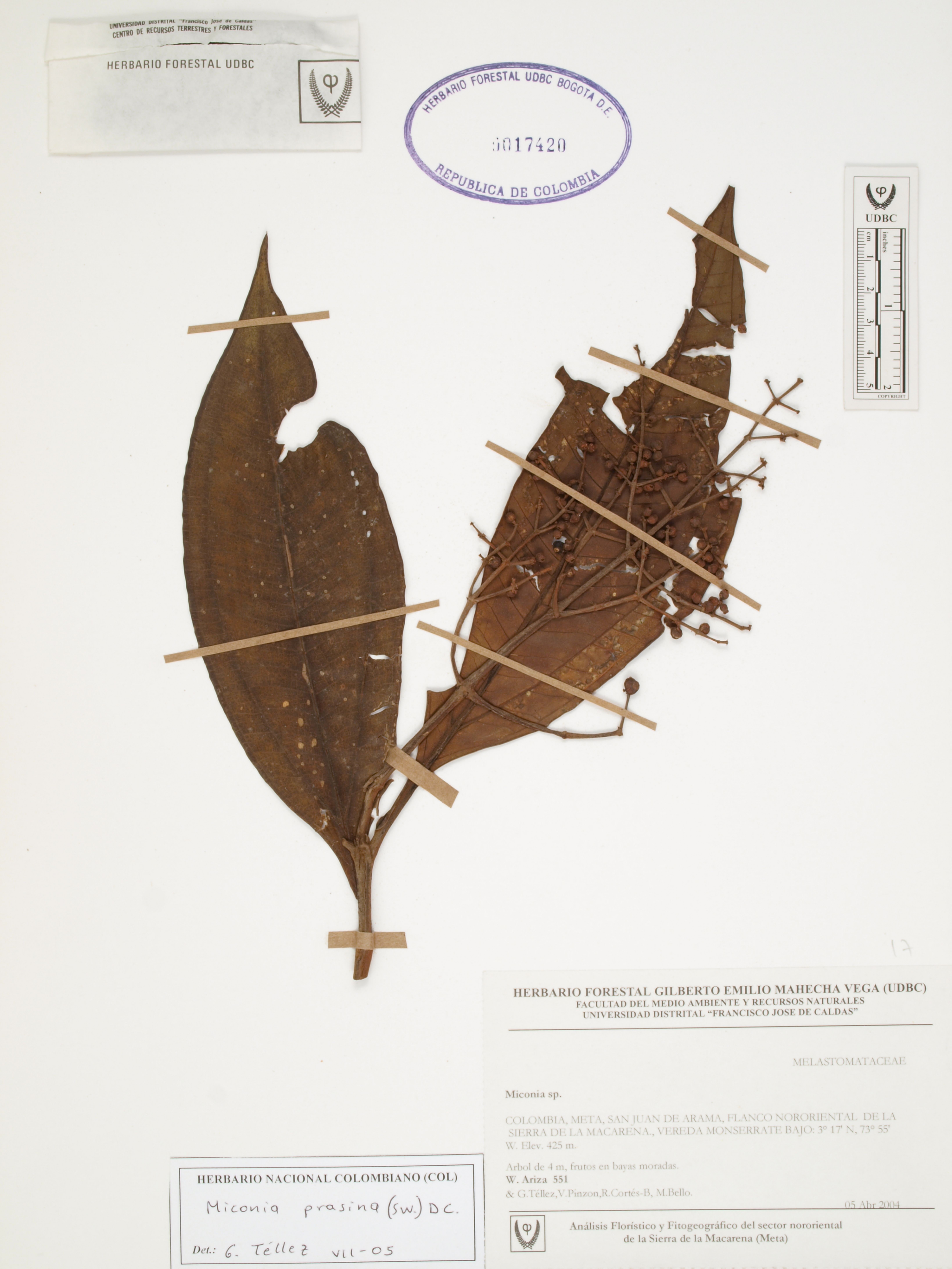 Fotografía del ejemplar Ariza, W. 551, determinado como Miconia prasina en el año 2005