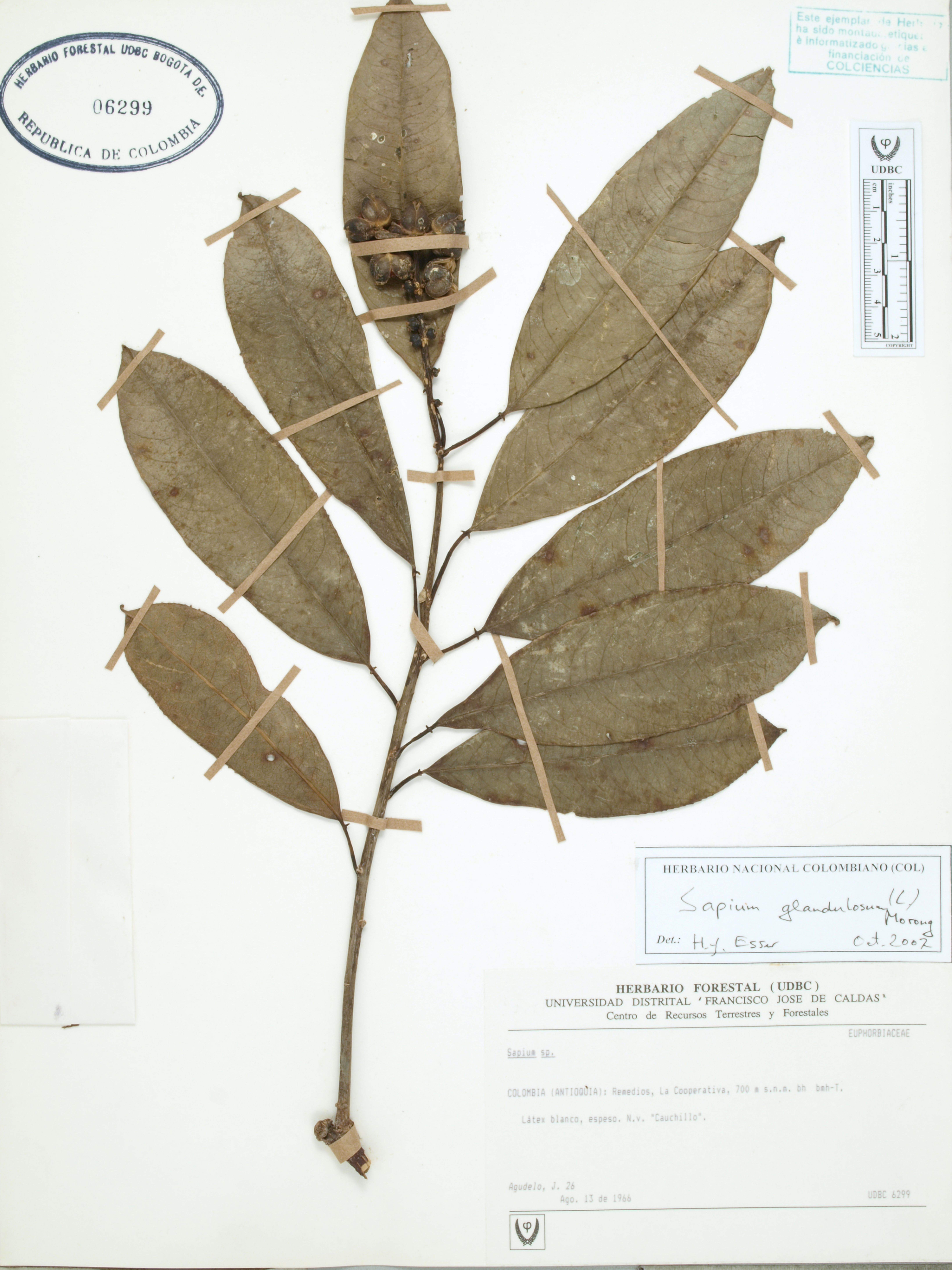 | dc.description | Fotografía del ejemplar Agudelo, J. 26, determinado como Sapium glandulosum en el año 2007 | |