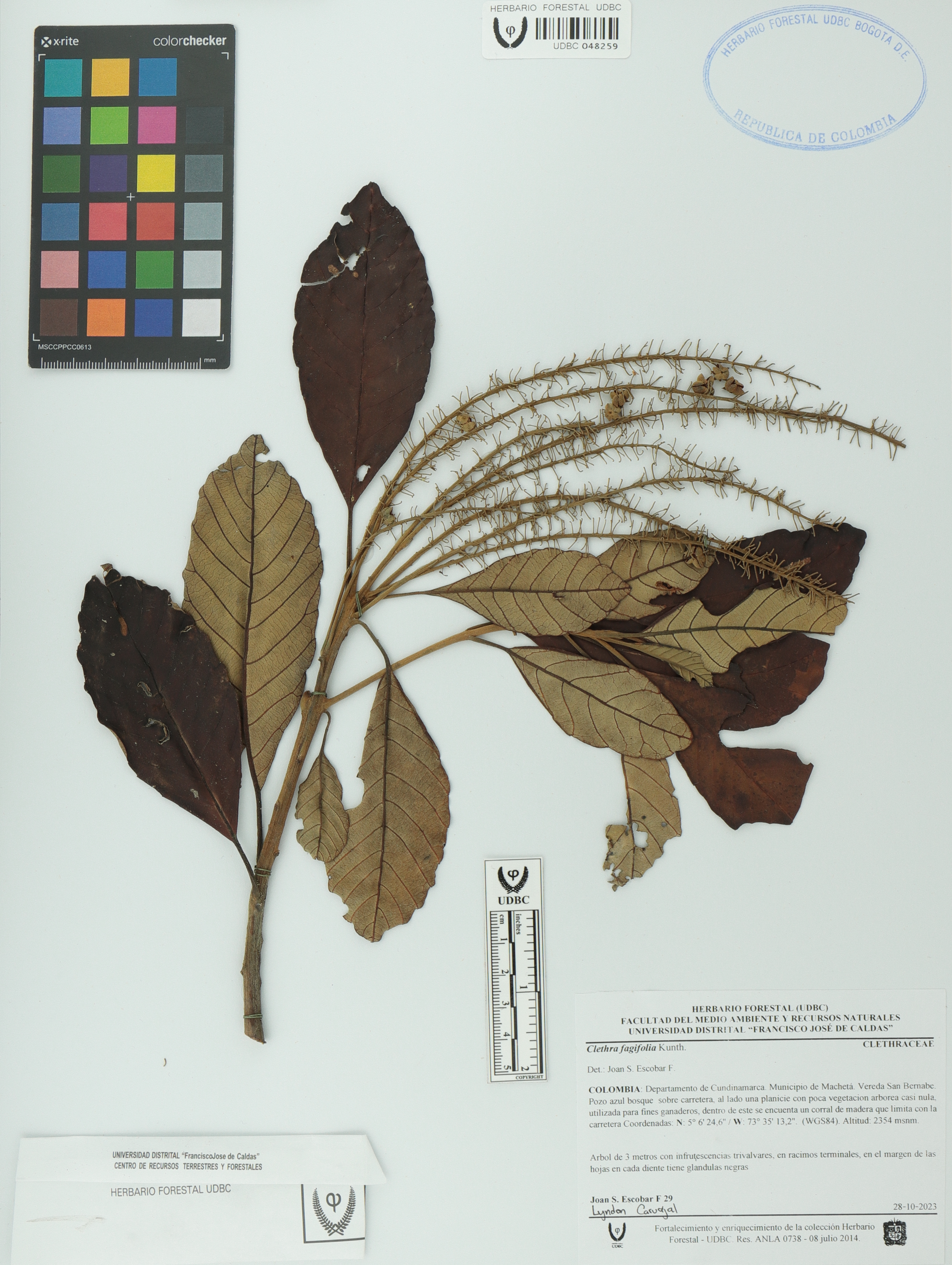 Fotografía del ejemplar Escobar, J. 29, determinado como Clethra fagifolia