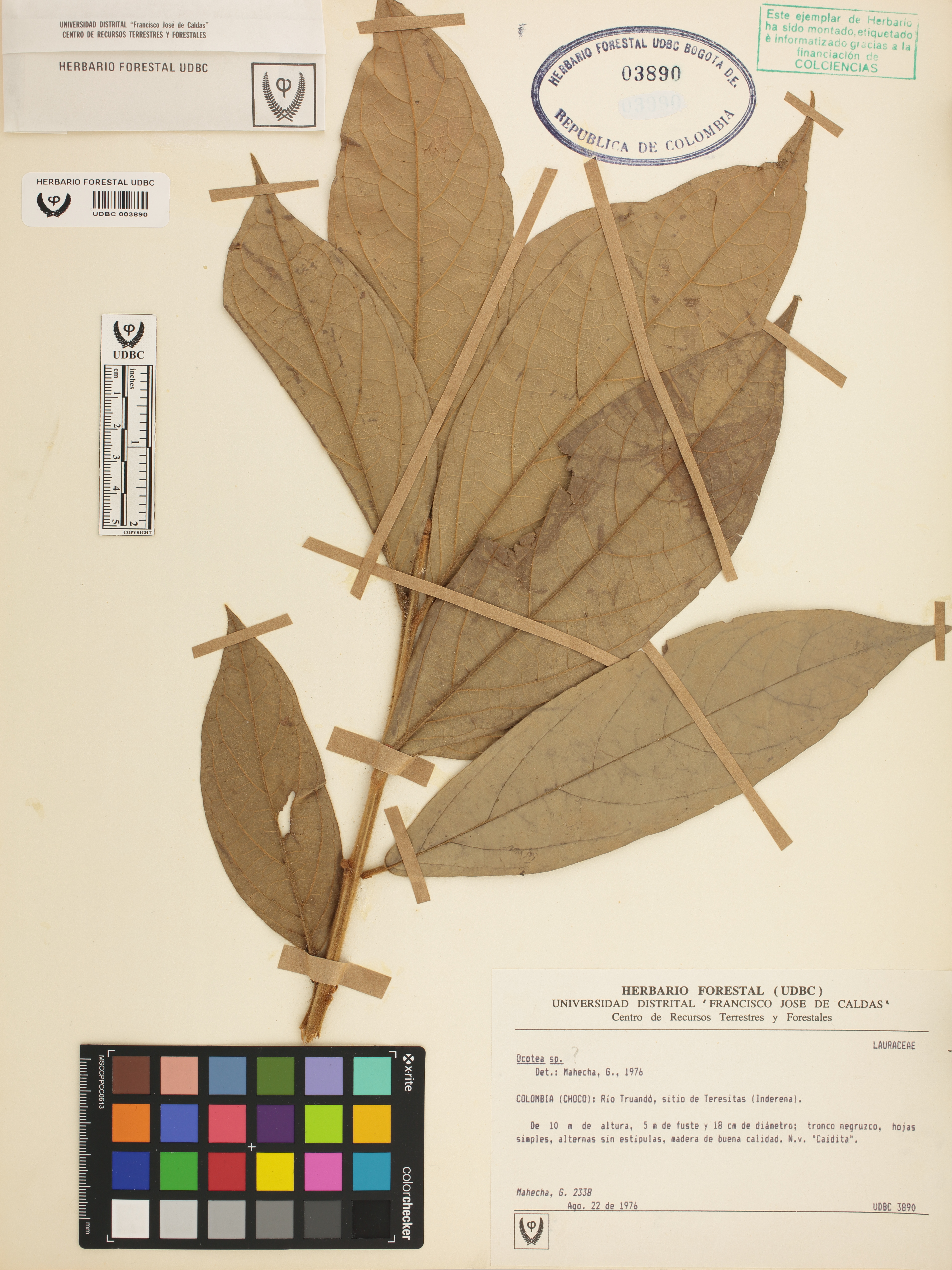 Fotografía del ejemplar Mahecha, G. 2338, determinado como Ocotea sp. en el año 1976