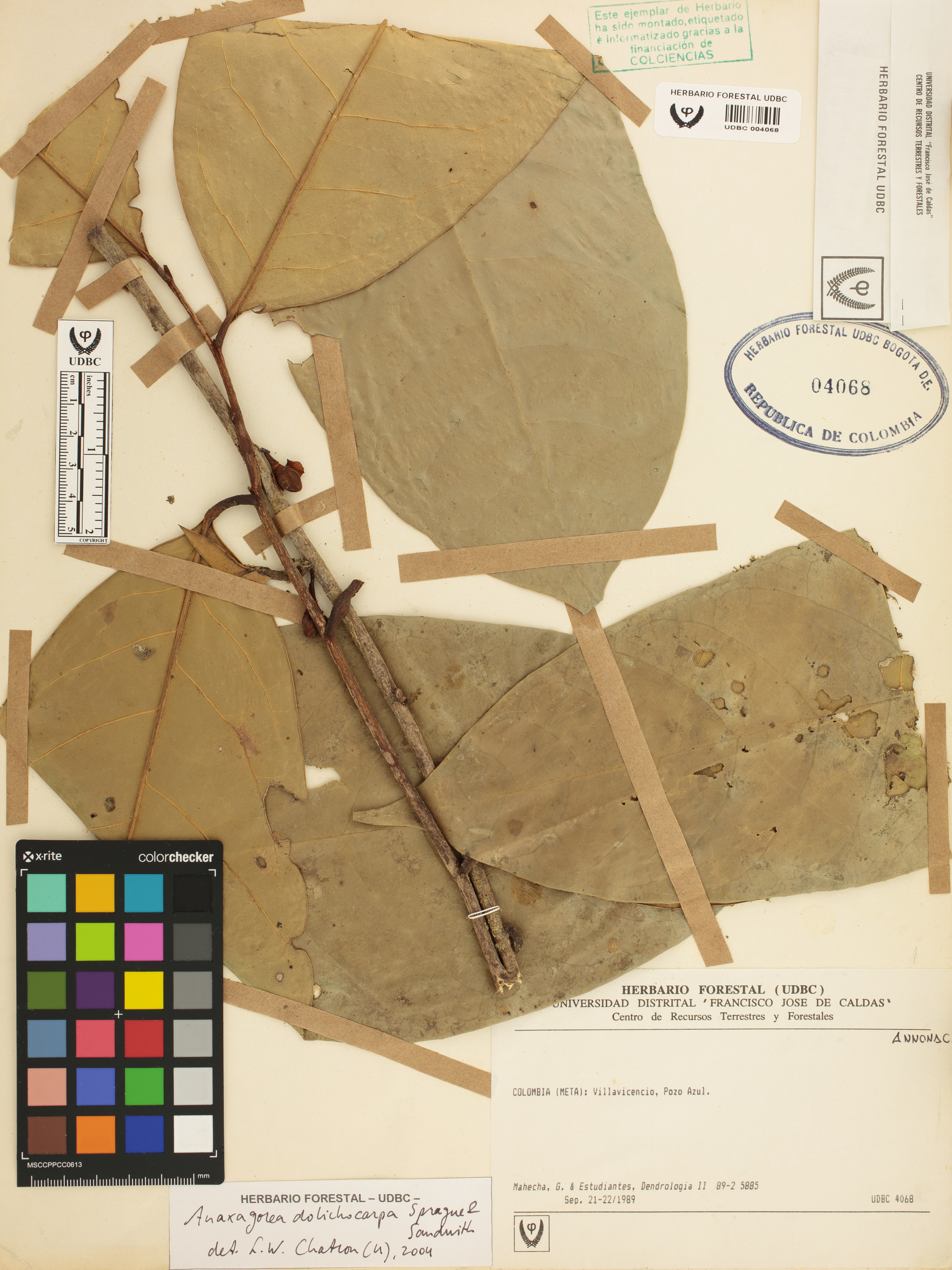 Fotografía del ejemplar Mahecha, G. 5885, determinado como Anaxagorea dolichocarpa en el año 2004