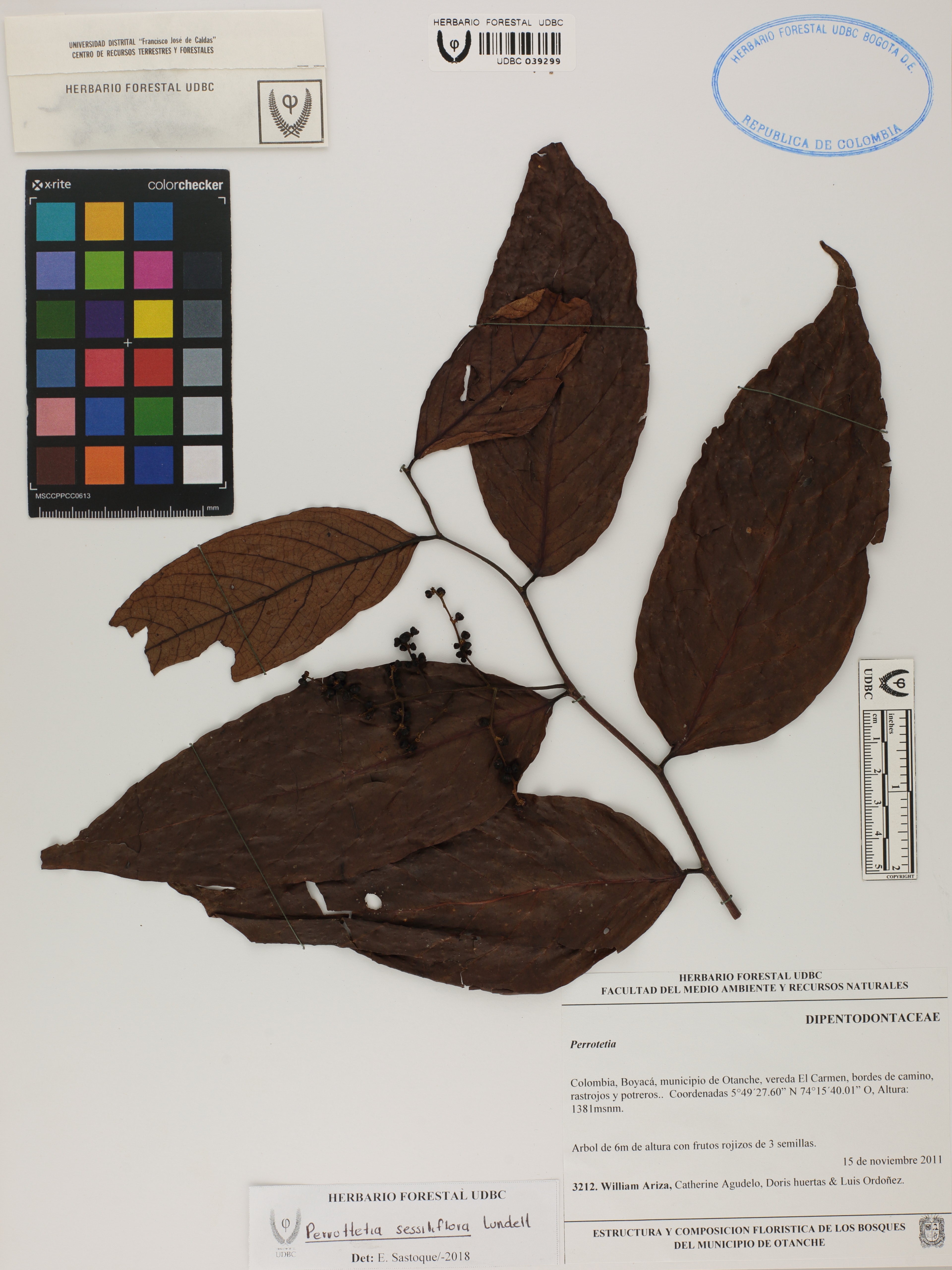 Fotografía del ejemplar Ariza, W. 3212, determinado como Perrottetia sessiliflora en el año 2018