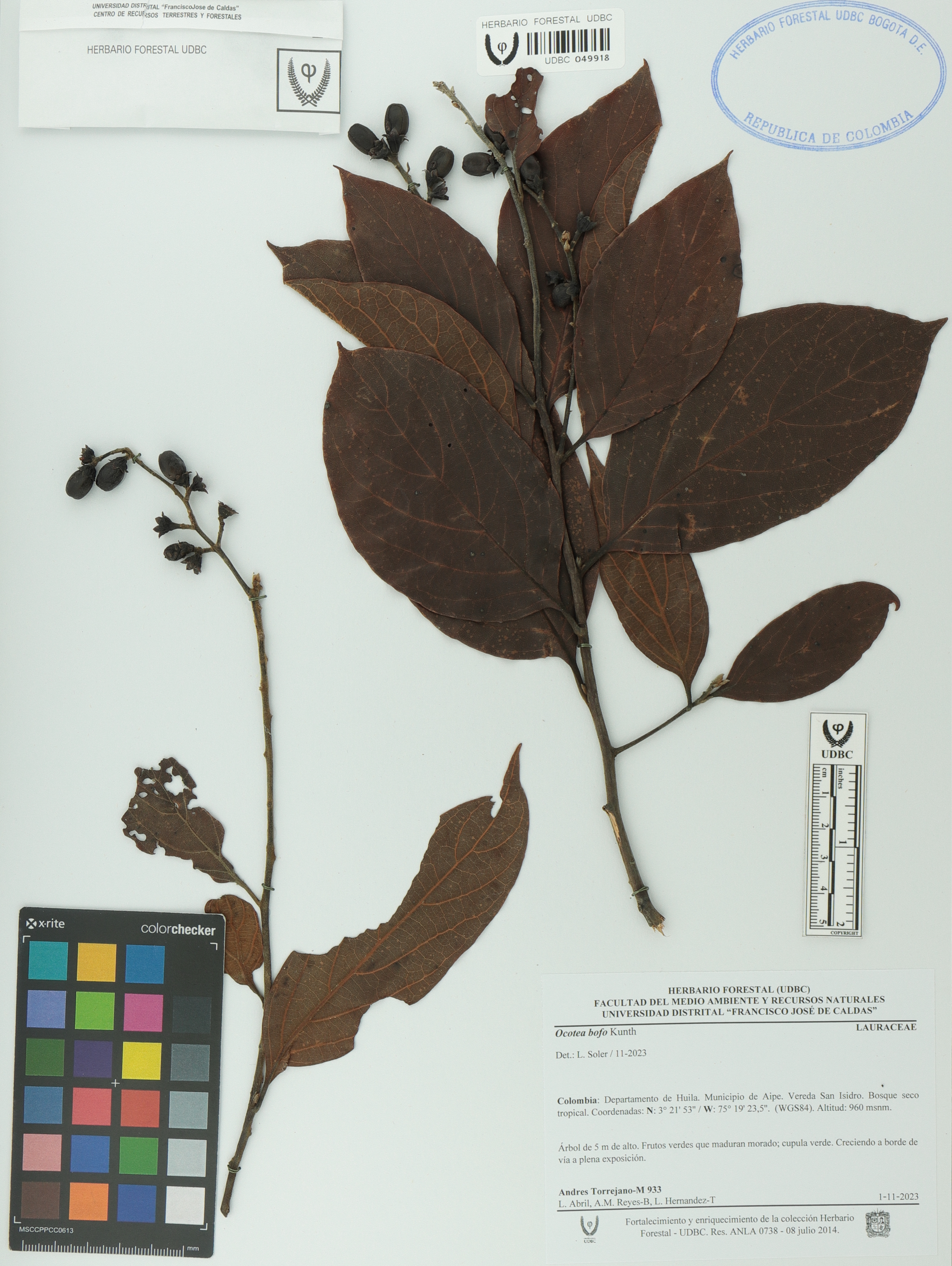 Fotografía del ejemplar Torrejano-M., A. 933, determinado como Ocotea bofo en el año 2023