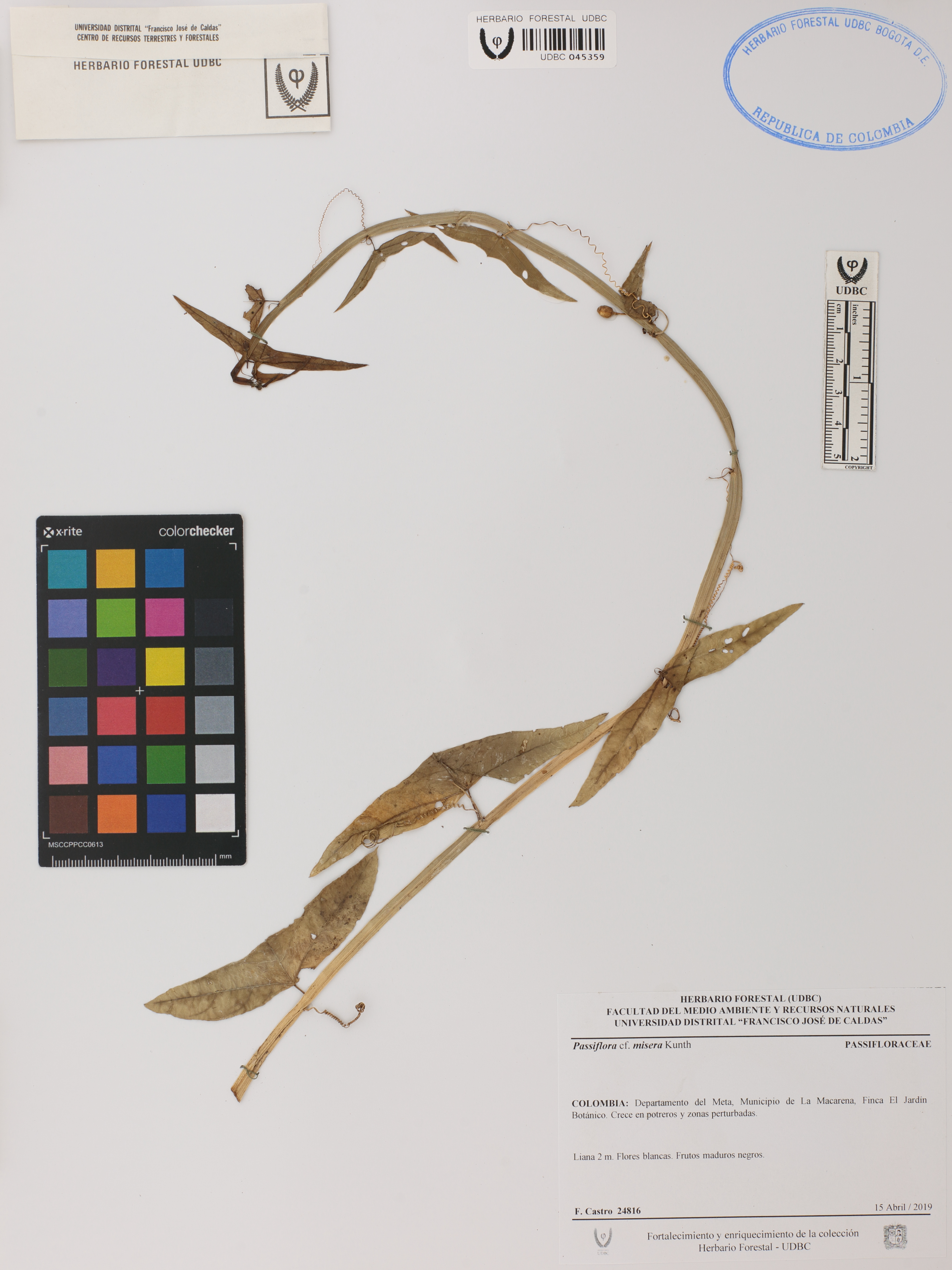 Fotografía del ejemplar Castro, F. 24816, determinado como Passiflora misera en el año 2019