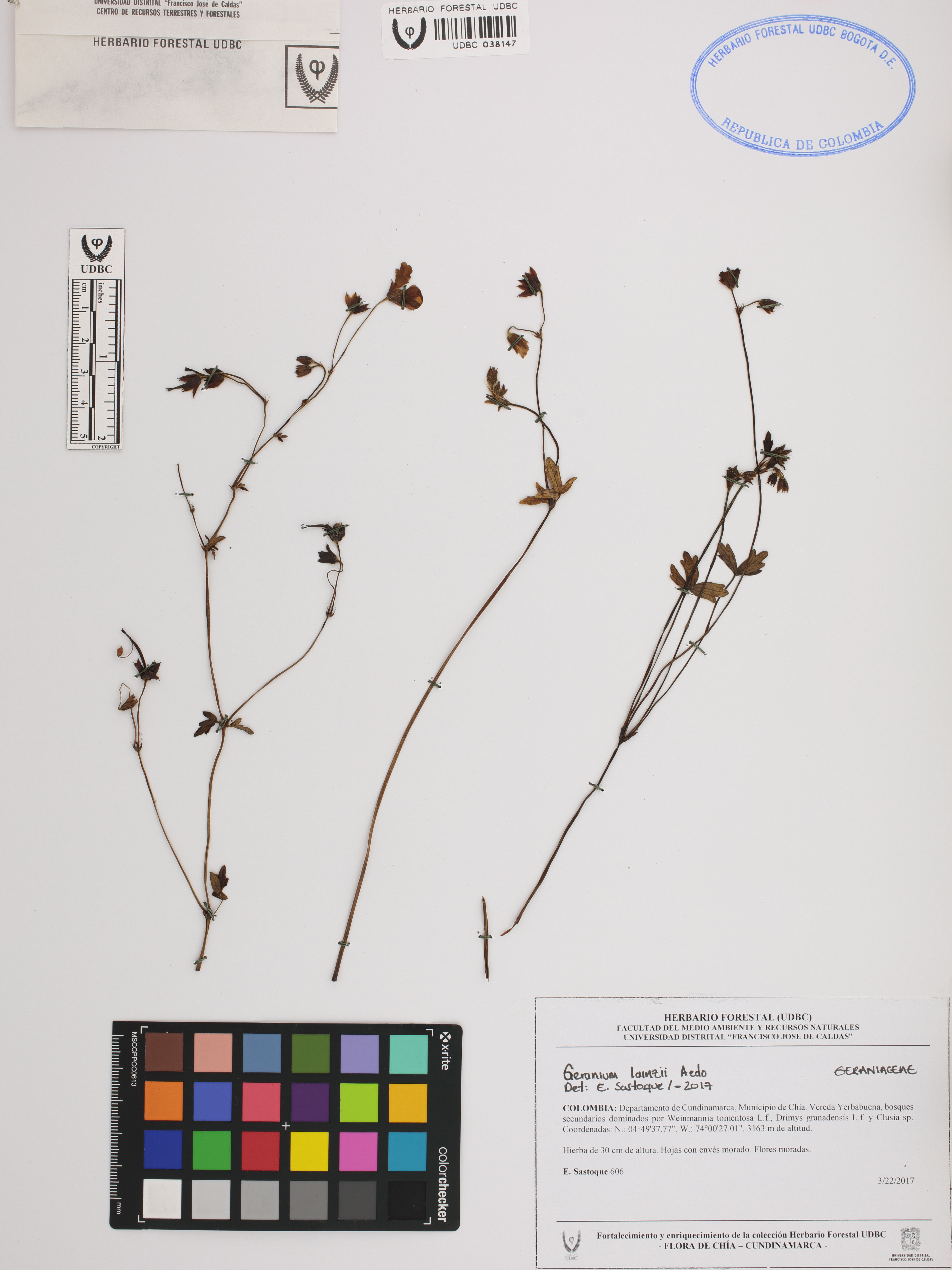 Fotografía del ejemplar Sastoque, E. 606, determinado como Geranium lainzii en el año 2017