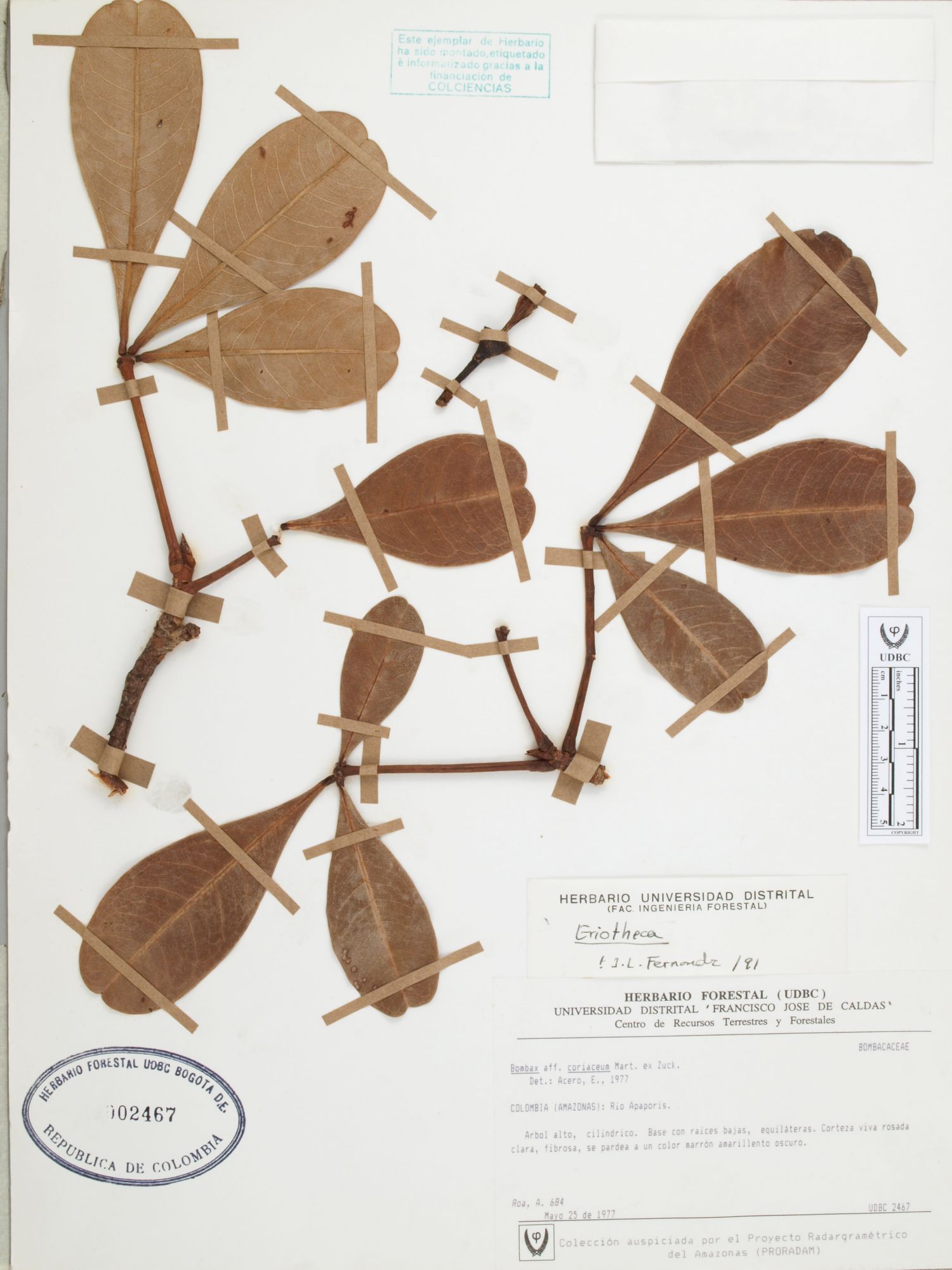 Fotografía del ejemplar Roa, A. 684, determinado como Eriotheca sp. en el año 1991