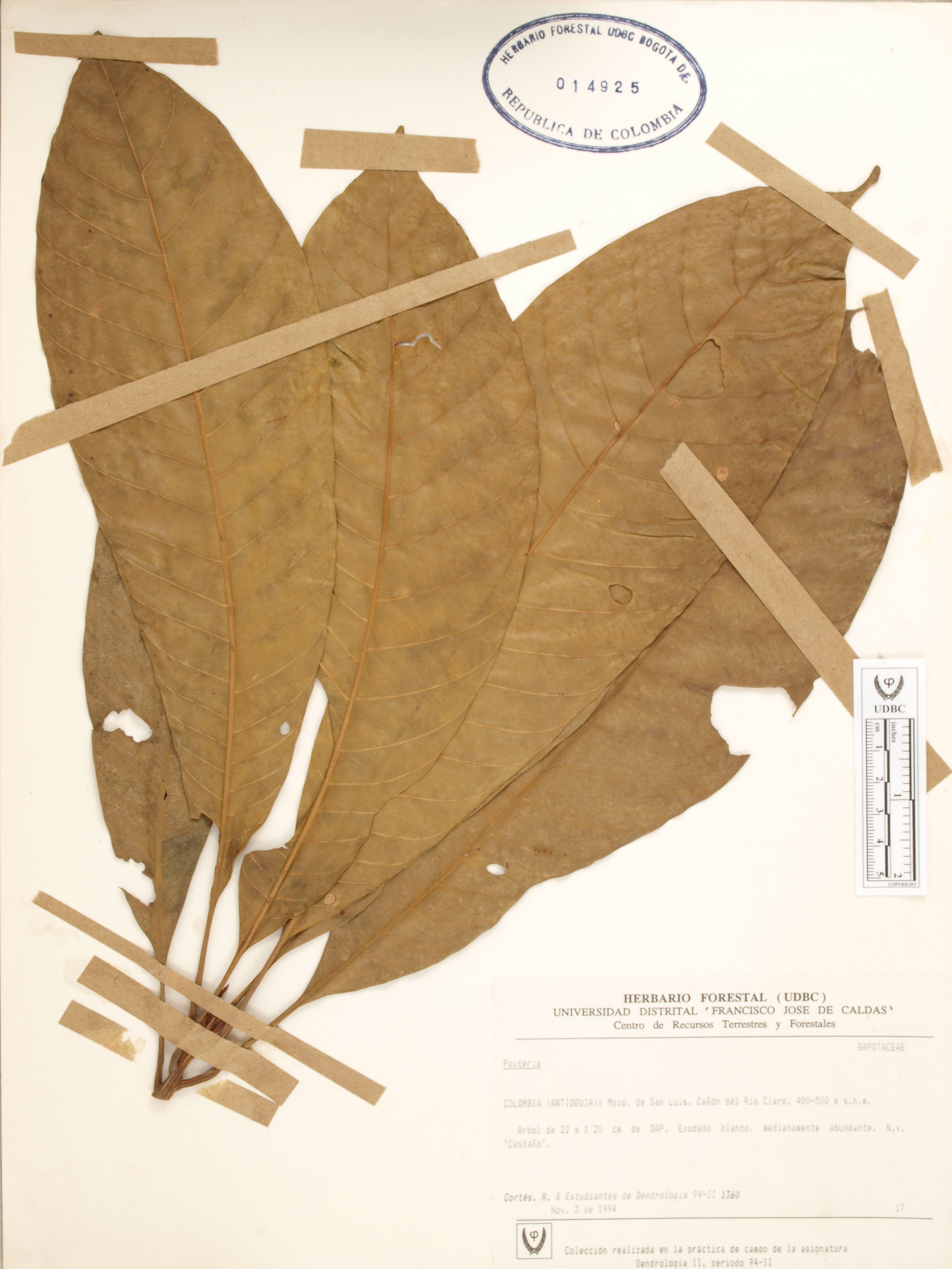 Fotografía del ejemplar Cortés-B., R. 1360, determinado como Pouteria sp.