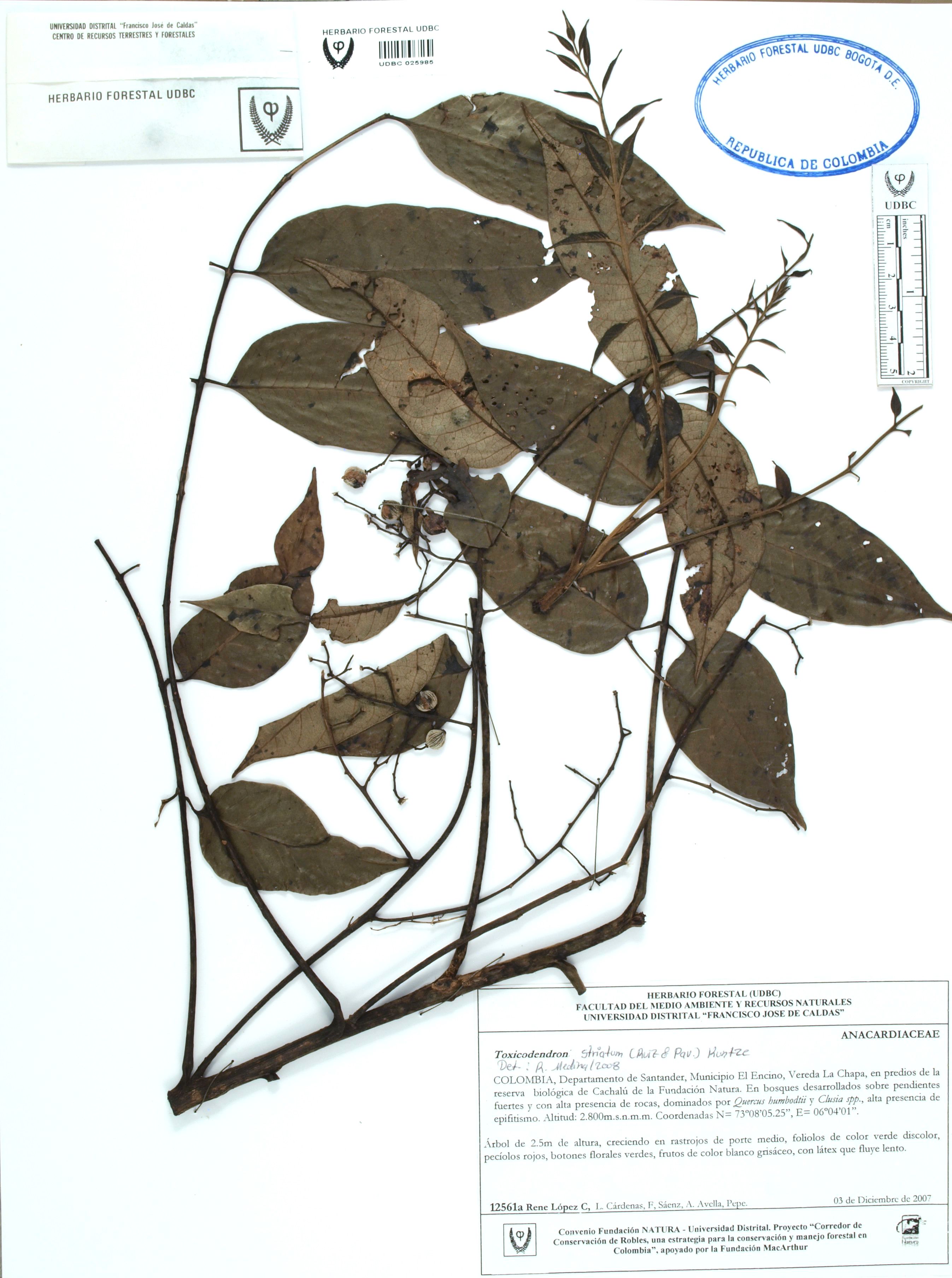 Fotografía del ejemplar López, R. 12561, determinado como Toxicodendron striatum en el año 2008