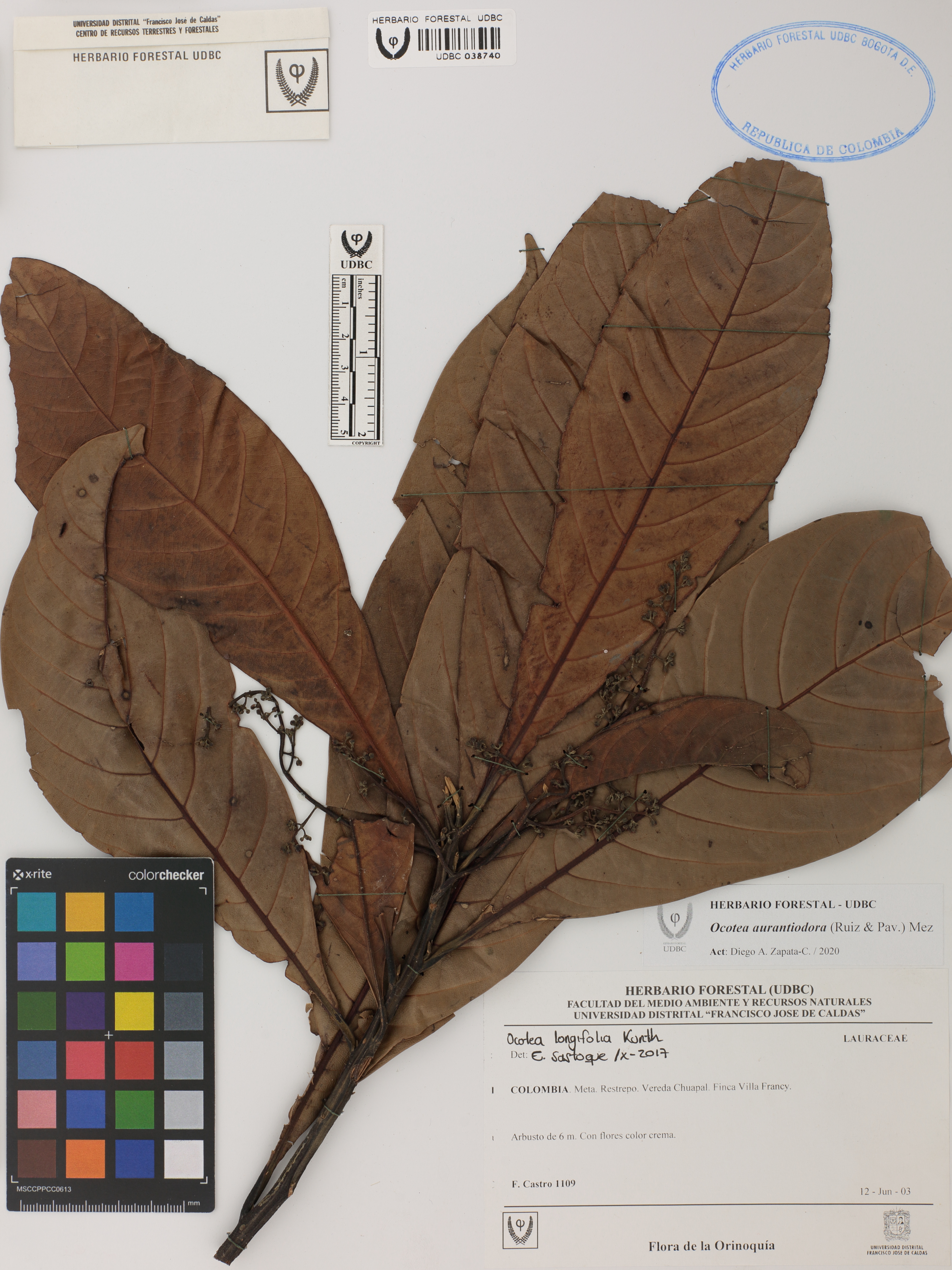Fotografía del ejemplar Castro, F. 1109, determinado como Ocotea aurantiodora en el año 2017